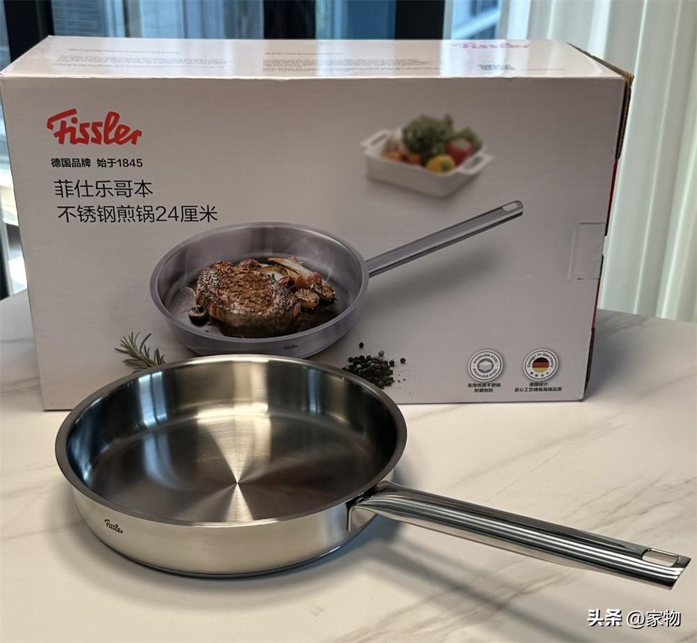 一箇中小號的煎鍋,材質是很亮的拉絲不鏽鋼,特別像那些高檔西餐廳會用到的廚具。