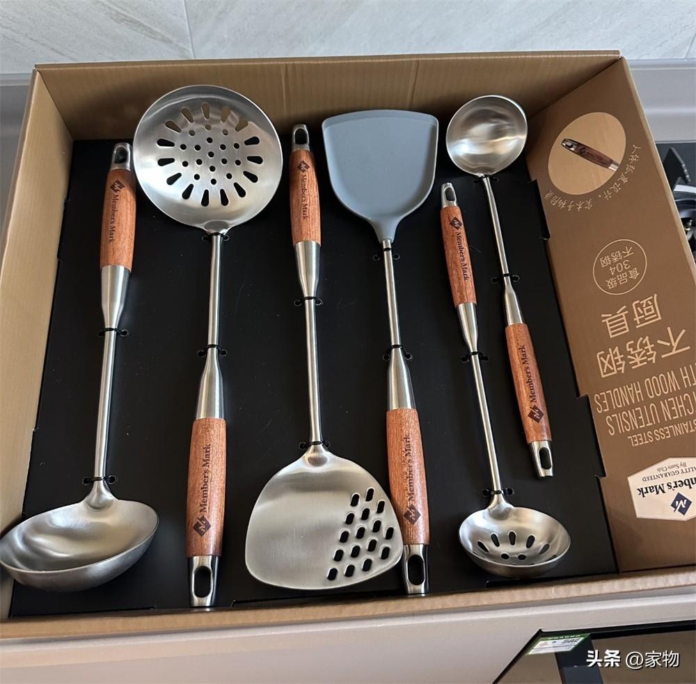 廚具本身主要都是不鏽鋼材質,只不過手柄採用了木質的,且每一個都帶有掛環(炒菜鏟頭是硅膠,不會劃傷炒鍋),好用好清潔又好收納,細節設計真絕了。