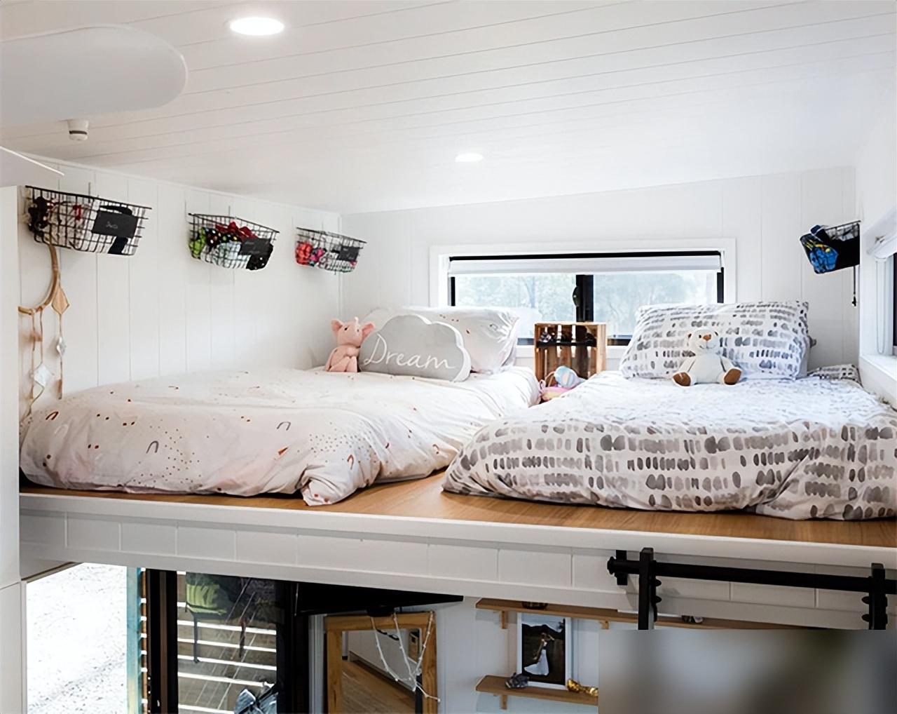 還有那位36歲大哥的24平米獨居小屋,懸空走廊當座位,斜頂天花板留足站立高度,牀頭拉簾隔音,細節到位。