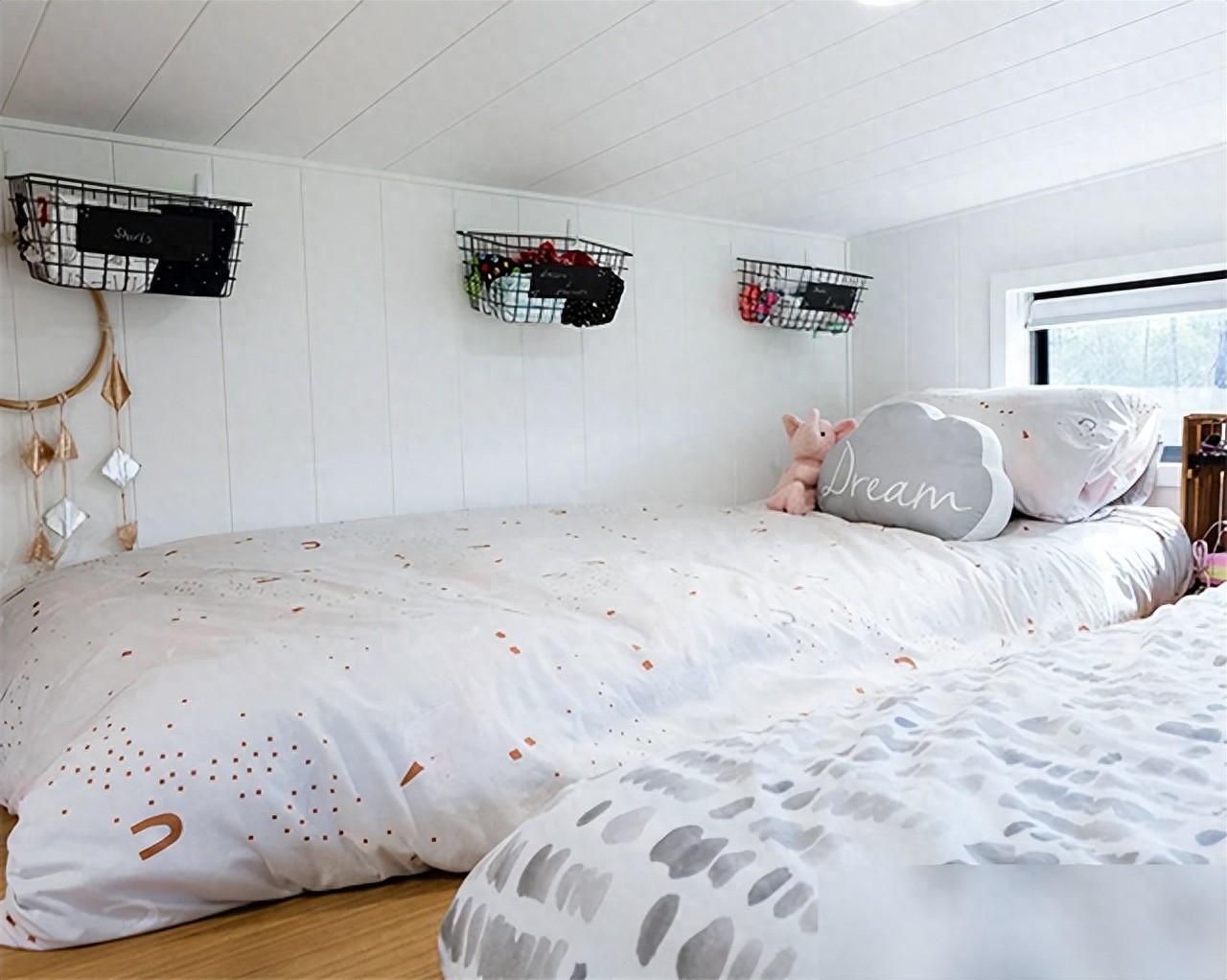 這種極限操作真叫人佩服,層高一點沒浪費,上下分開的主臥兒童房,樓梯下的犄角旮旯全變成儲物櫃,廚房開窗加吧檯,衛生間還能幹溼分離。