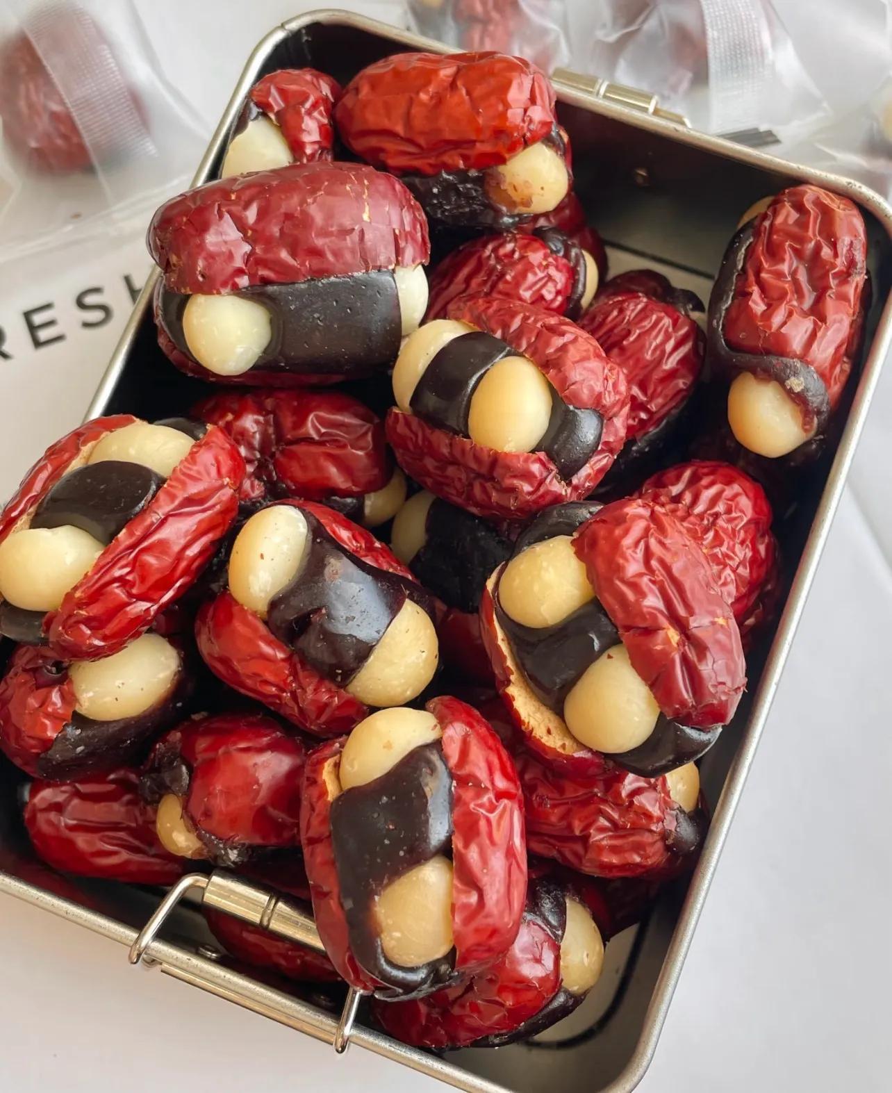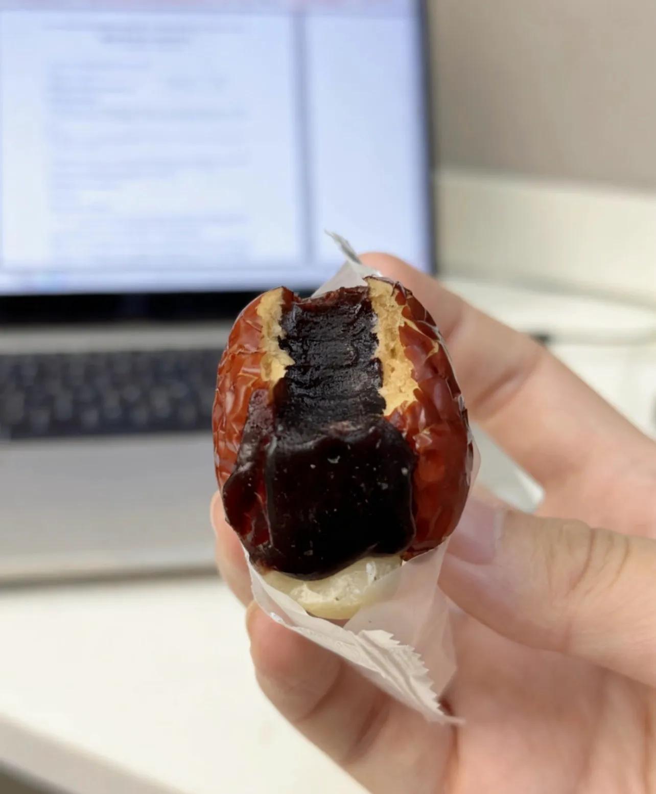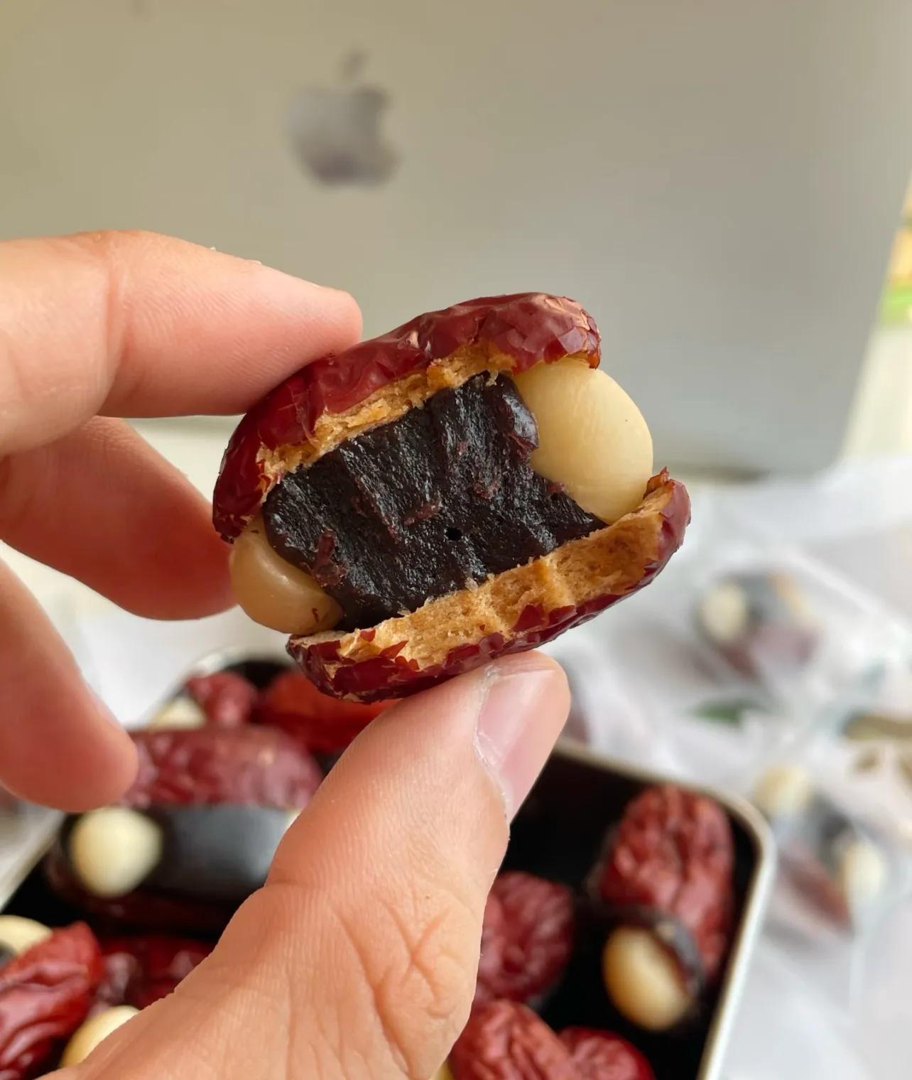 它外面是紅棗,裏面是麥芽糖和血糯米做成的膏體,最外側還夾着夏威夷果。