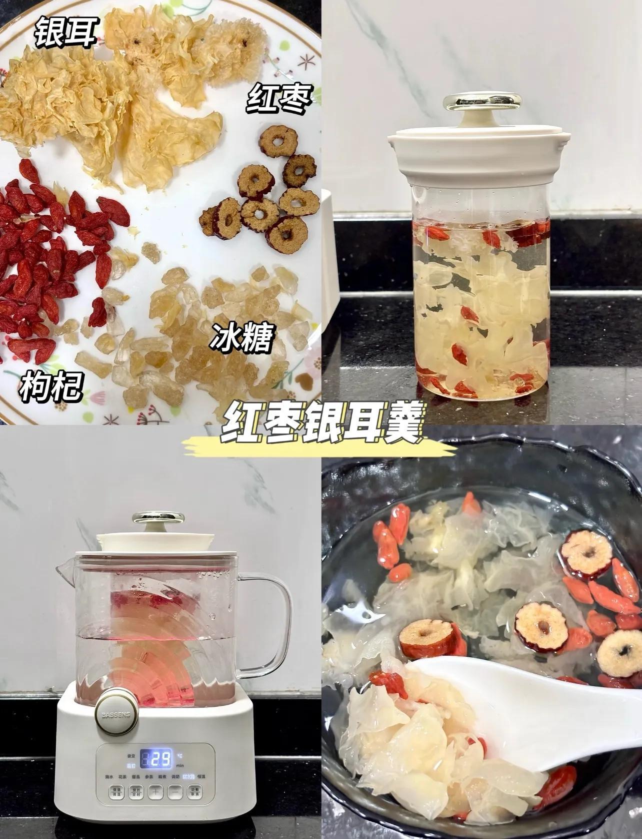 紅棗銀耳羹,紅棗還是主咖,負責氣血,枸杞二當家,含有胡蘿蔔素、類黃酮,養肝護目,銀耳老末,裏面有多糖,可抗氧化、潤肺止咳。至於冰糖,還是主要是口感的作用,屬於減分項目。