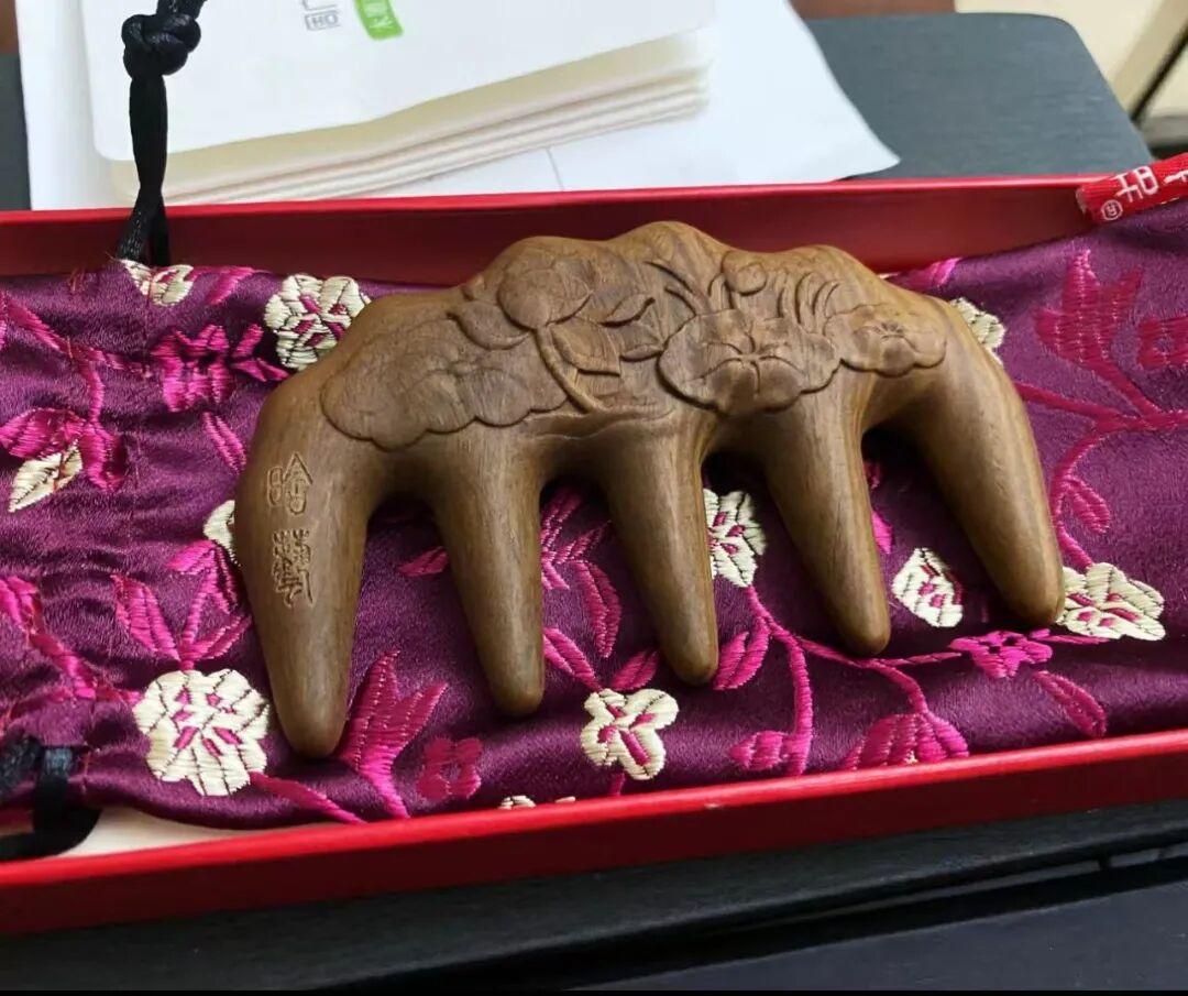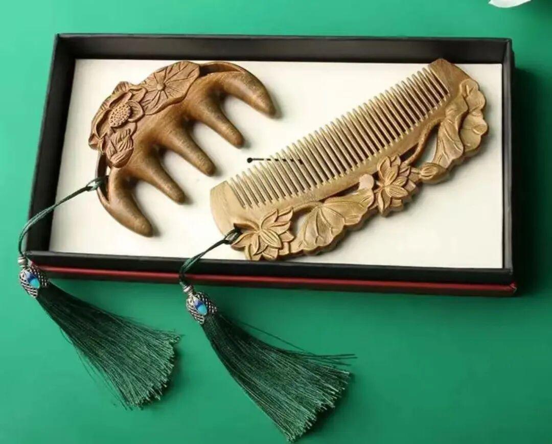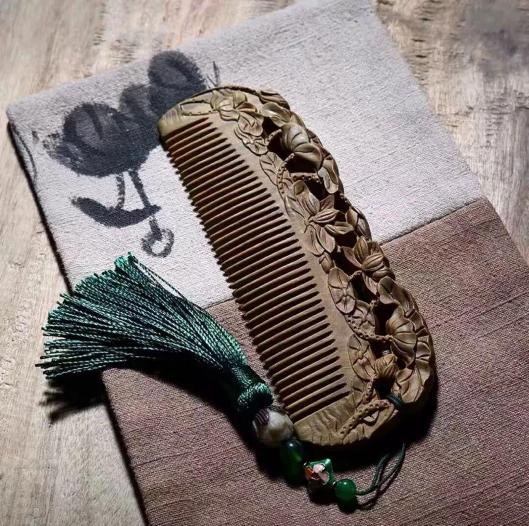 深綠色流蘇配着溫潤的檀木梳子,雕花細膩得像是博物館裏的藏品。