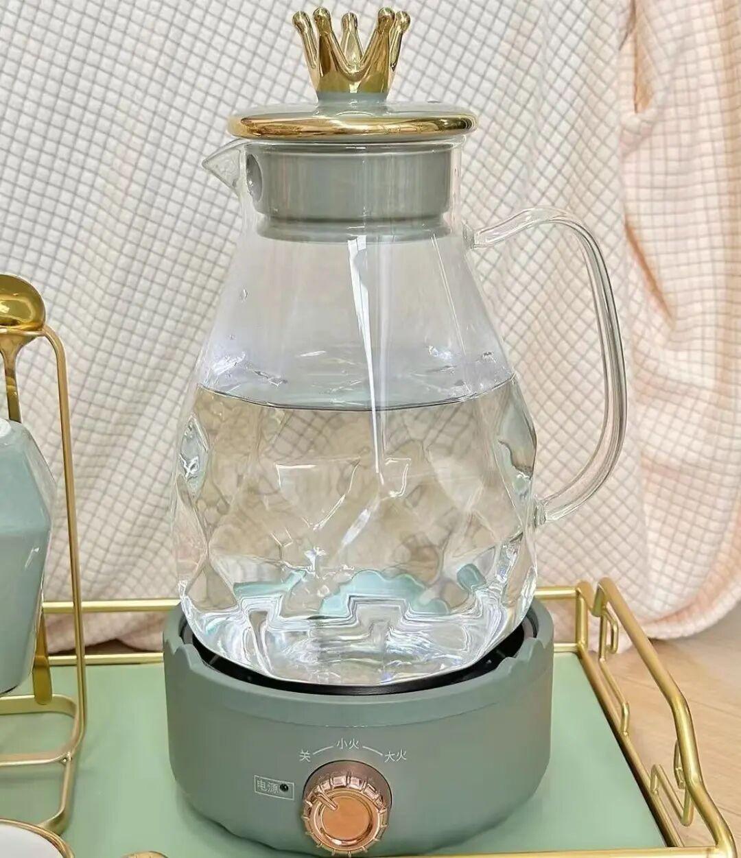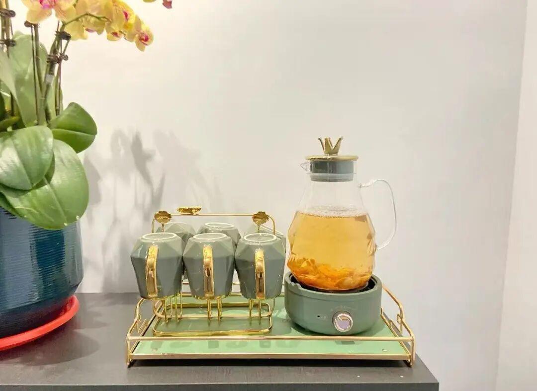 而且煮茶特別方便,材質是耐熱玻璃,可以用下面的陶爐加熱,配的六個杯子剛好適合待客。