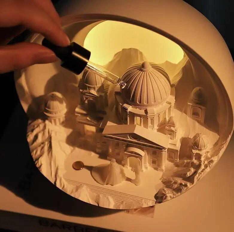 類似石膏材質的歐洲風情雕塑在柔光下美得不可方物,燈光透過不規則的層層錯落有致的設計,在牆上投下斑駁光影,簡直是把文藝復興搬進了臥室。