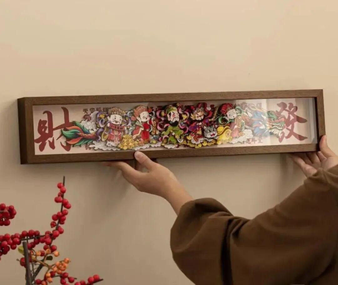 這木質畫框裏的立體剪紙栩栩如生,剪紙的層次感非常豐富,前後疊加出了立體的視覺效果。