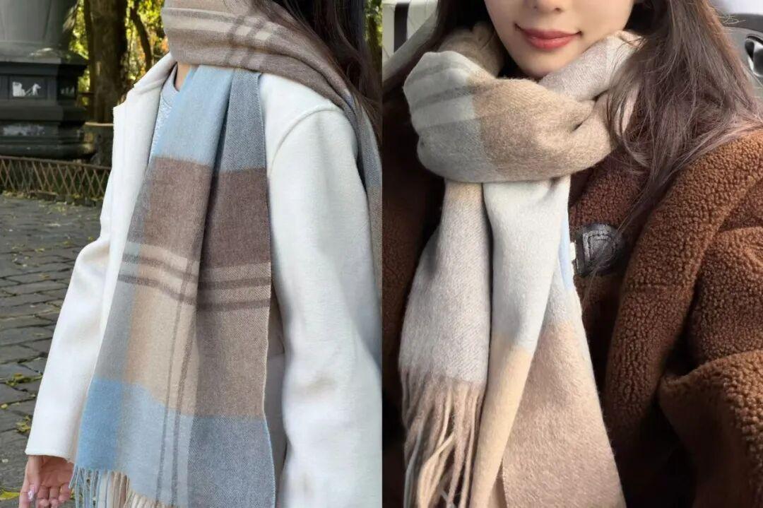 它藍灰格的設計復古又百搭,羊絨材質柔軟親膚,圍在脖子上輕盈又保暖,完全不會有刺癢感。