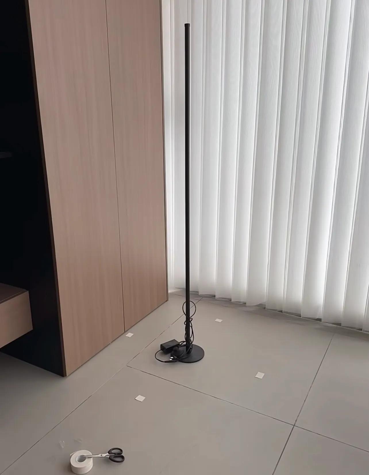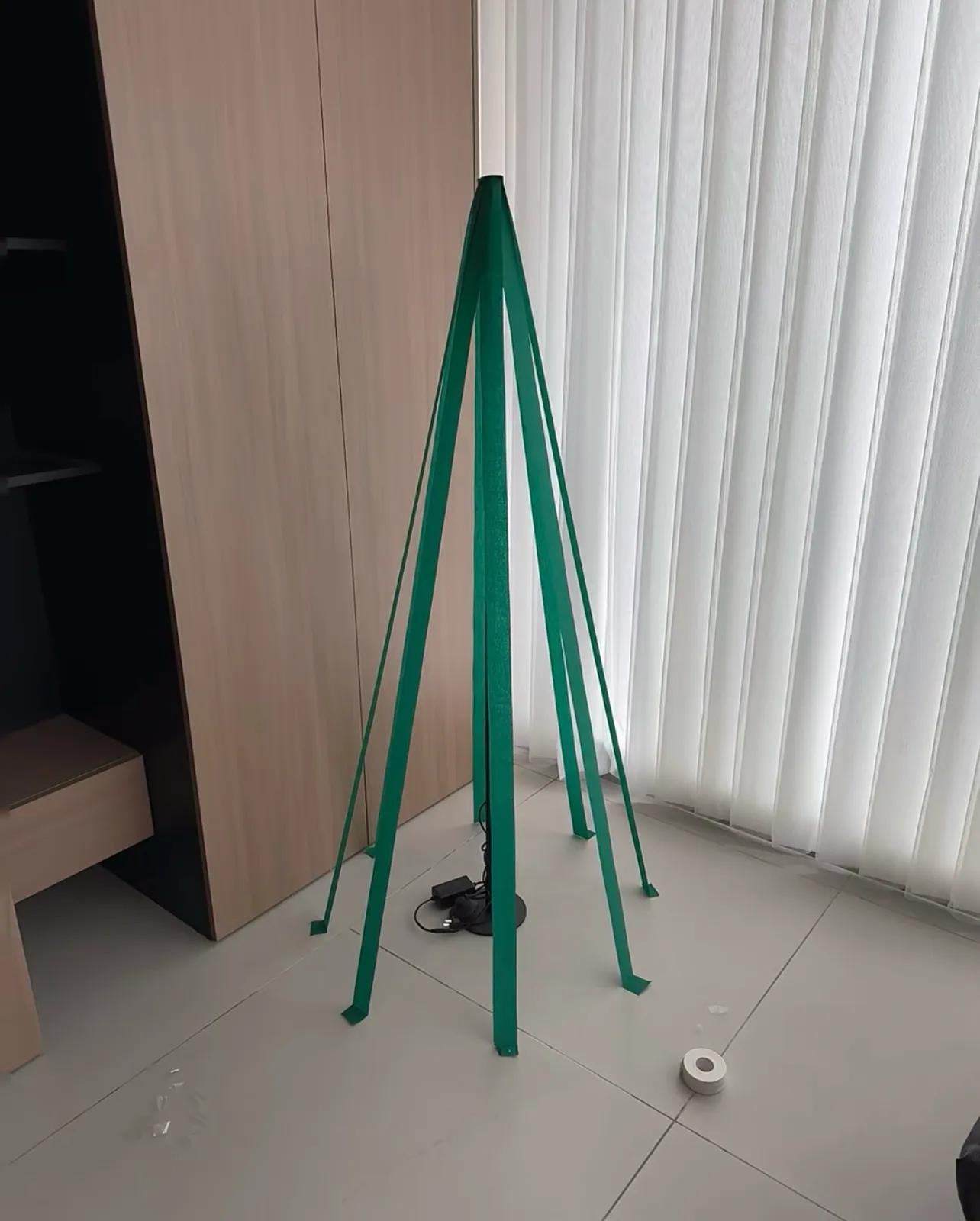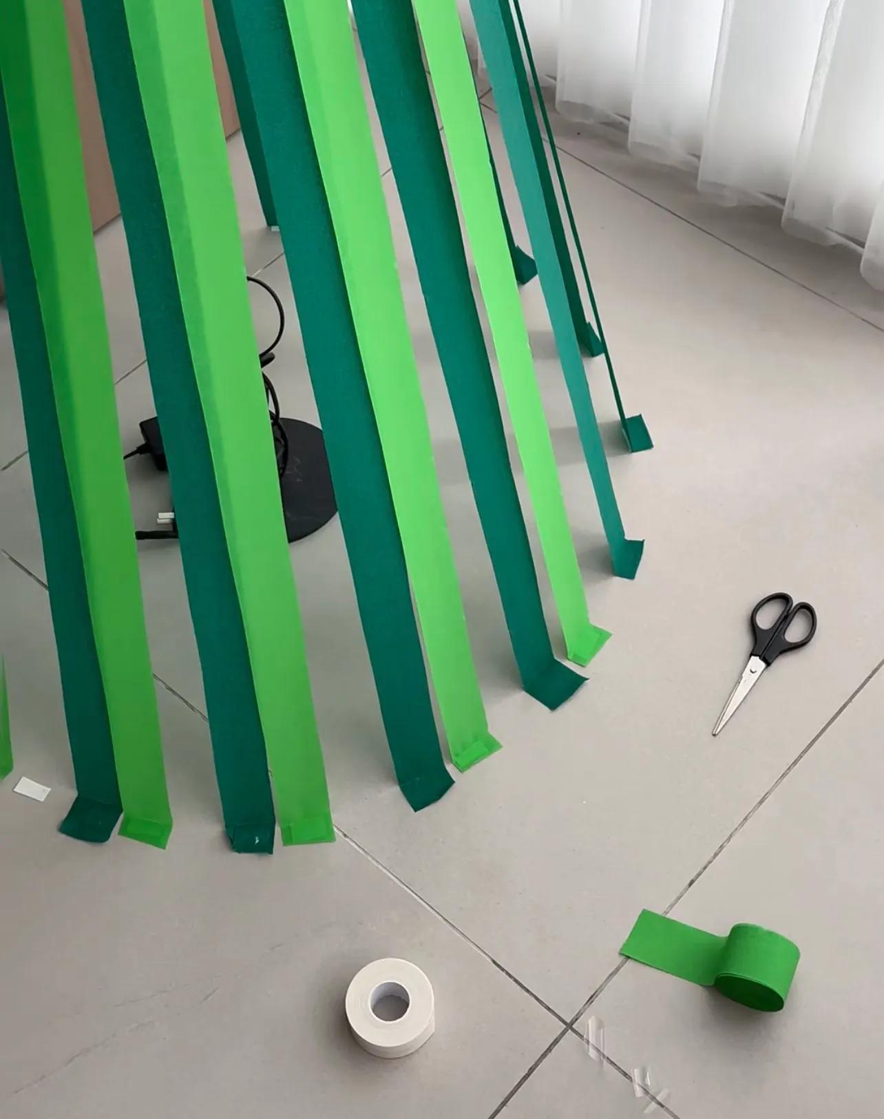 材料清單:閒置的落地線形燈、綠色皺紋紙、雙面膠、星星裝飾。
