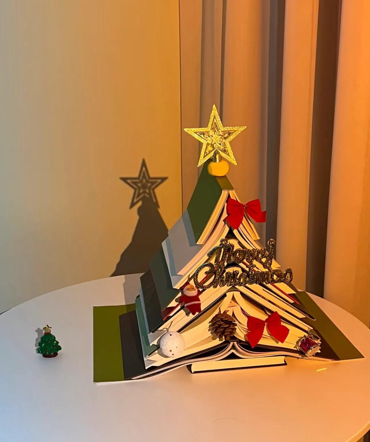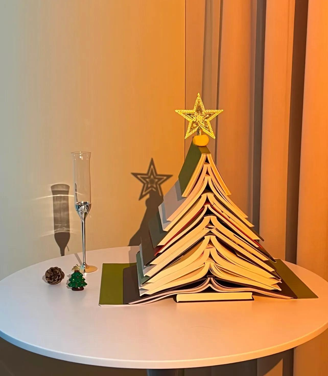 把書一本本打開,大書在下,小書在上,穩穩地摞起來,再在最頂端加點裝飾,真的很有聖誕樹的感覺!