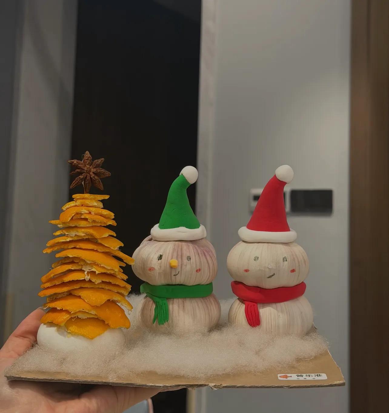 橘子皮+八角,下面是粘土底座;大蒜+粘土圍巾、帽子,連接部分可以用牙籤,再加上小表情,萌感立刻有了。