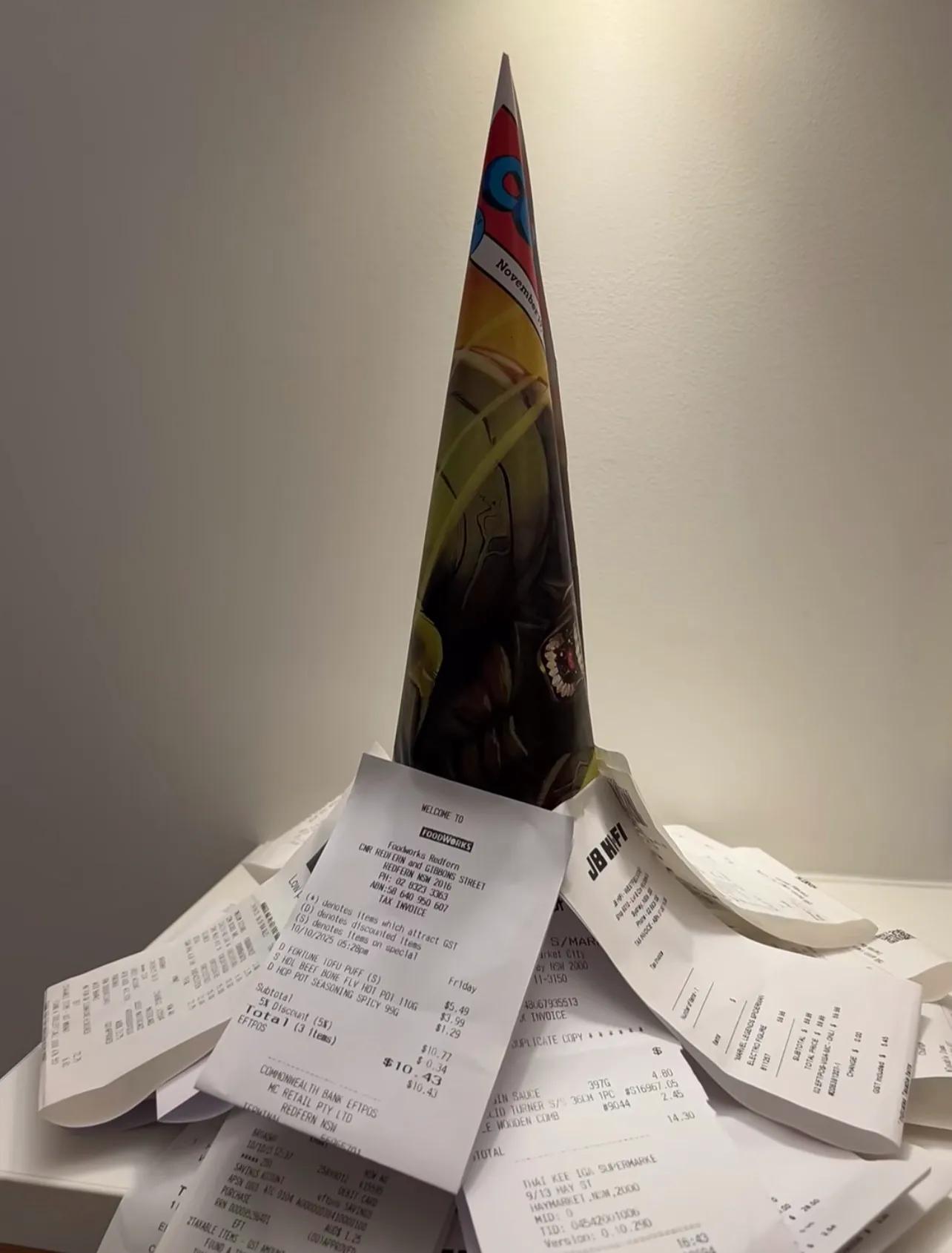 再把小票們對摺,從下往上一層層、錯開貼上去,不用貼到頂,上面留出一小截裝飾空間;