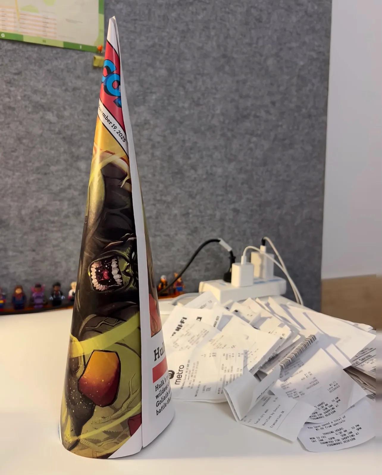 做起來也超簡單:報紙捲成圓錐桶一粘,樹的筋骨就有了;