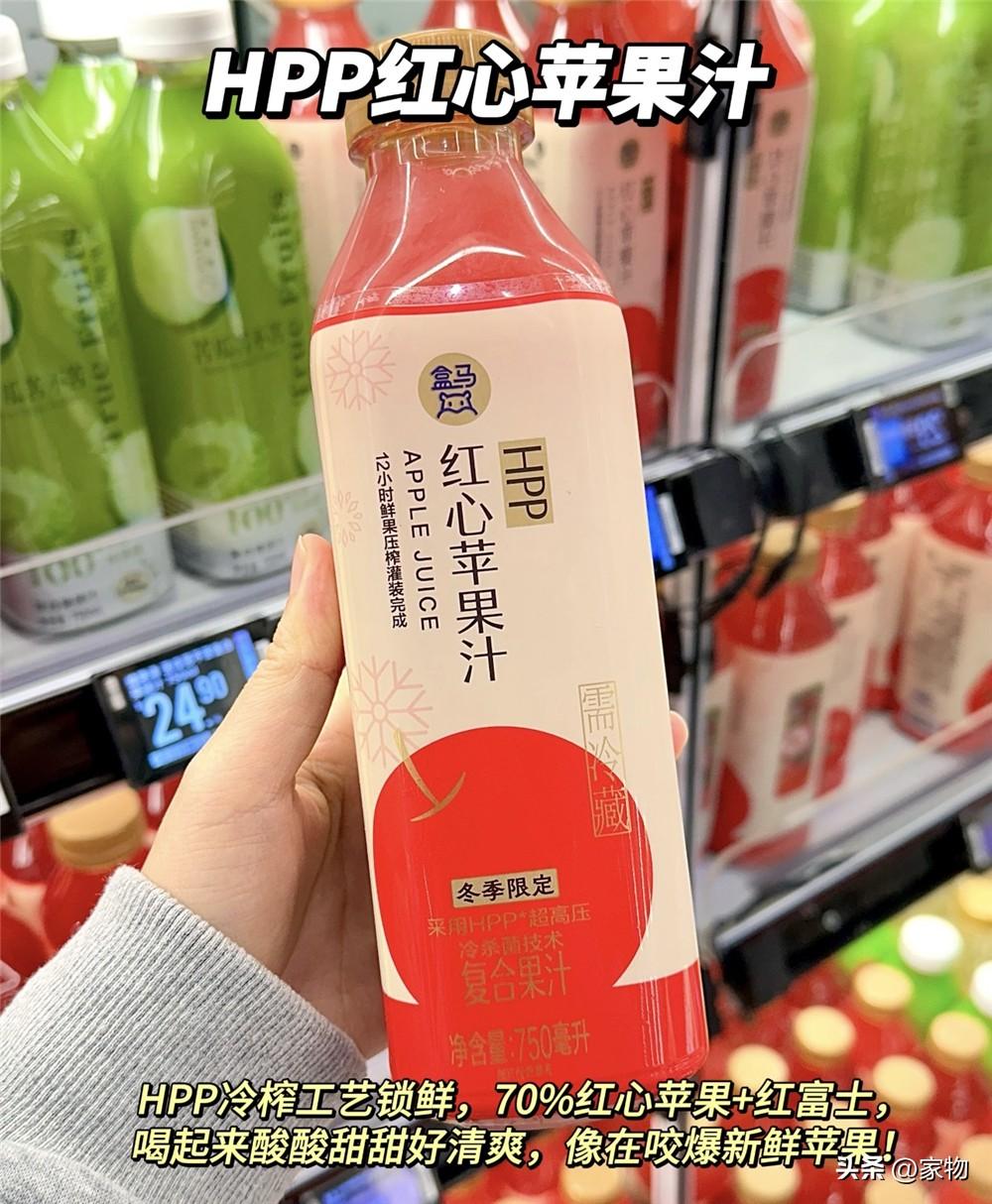 堪稱盒馬的“冬季限定”蘋果汁,和許多調味型、香精味很重的蘋果汁飲料不同,它採用HPP冷榨工藝,添加了70%的鮮榨紅心蘋果和富士蘋果果汁,不誇張地說,每一口都像是在喫下無渣的蘋果。