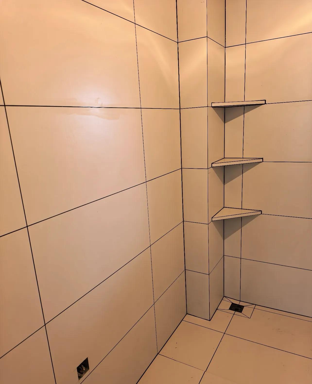 但它的缺點是難清理,必須邊填縫邊擦,一個不及時,彩砂凝固在瓷磚表面,後續想弄乾淨能把你累趴下,非常費勁。如果是灰、米黃色號,纔會沒那麼明顯。