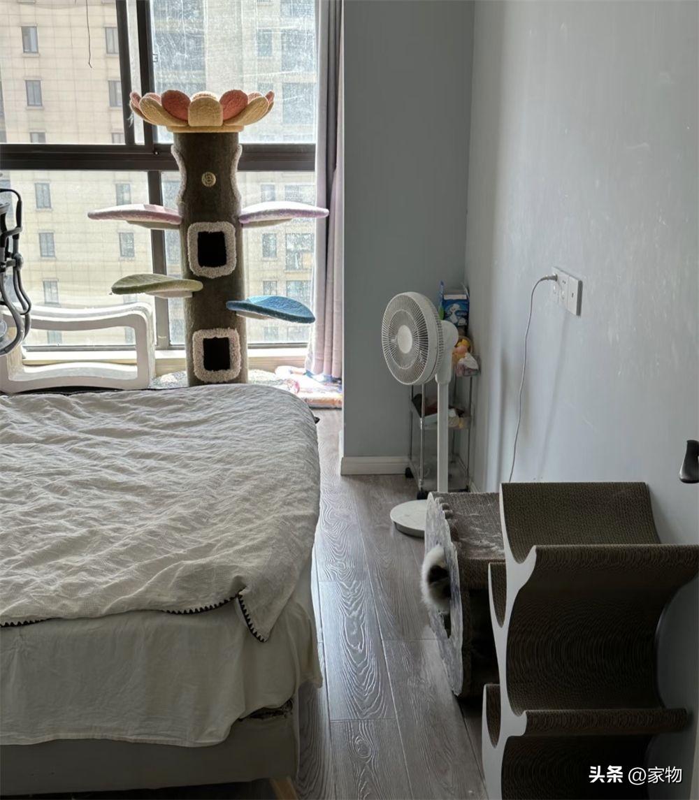 家裏主臥室的裝修,自然也同樣考慮到了人貓共處的情況,在中間擺上一張大牀,周圍則全都是貓咪的用品,尤其是牀尾,放了兩組貓抓板,角落裏甚至也擺上了架子,放一些毛梳、毛條等物也剛好合適。