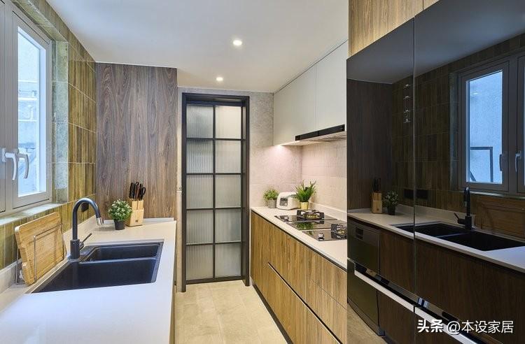 冰箱佈置在入口處,符合取-洗-切-炒的生活動線,地櫃中還嵌入安裝洗烘一體機,解決了無陽臺的洗曬問題。[玻璃推拉門內室保姆房]