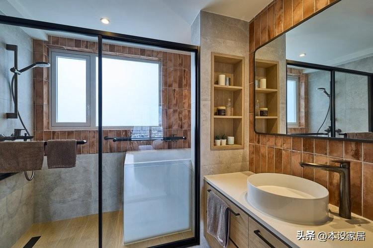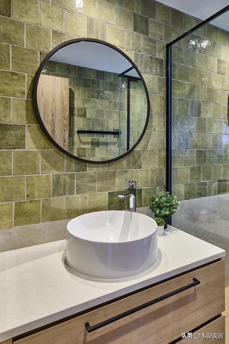 主衛和次衛的地面鋪設木紋磚,牆面分別使用抹茶綠和咖色牆磚,黑框超白玻璃隔斷作區域劃分,乾淨衛生。而洗漱臺抽屜櫃、淋浴房的壁龕和馬桶後的收納櫃,都能讓洗漱用品和清潔用品得到整齊的收納。