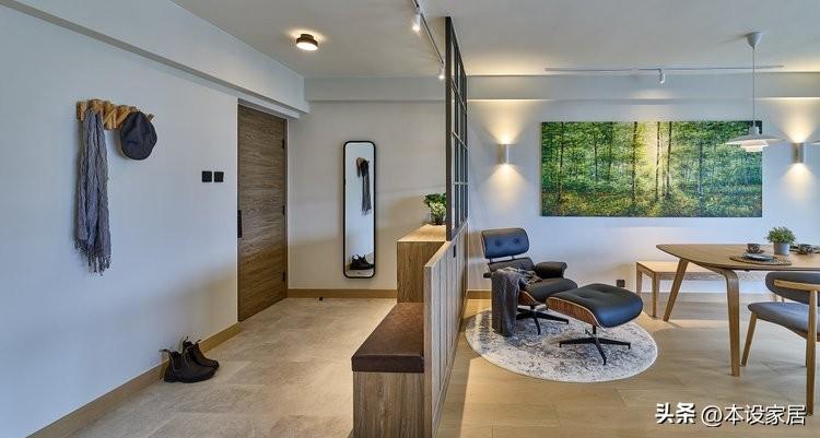雖然這個戶型沒有獨立玄關,但機智的設計師內推1.2米,設置一道鋼框玻璃的軟隔牆,並定製一組鞋櫃+換鞋凳的組合櫃,搭配兩側牆面的鏡子和掛鉤,滿足進出門衣物的收納需求。