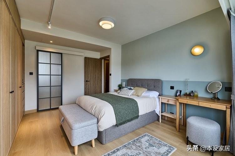 主臥進門左側是衛生間,牀頭背牆刷分段薄荷綠漆,搭配同色系的牀品,帶來一份清新和沉靜的氛圍。在他們看來,家本就該擁有不被定義的呼吸感。