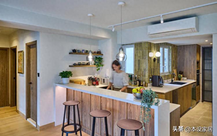 廚房面積約5㎡,拆除了原有與客餐廳的隔牆,改做吧檯,打造一個半開放式廚房。