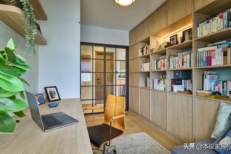 書房同樣採用金屬框玻璃移門,書櫃和書桌靠兩邊牆佈置,視線通透,也可以給走道補光。