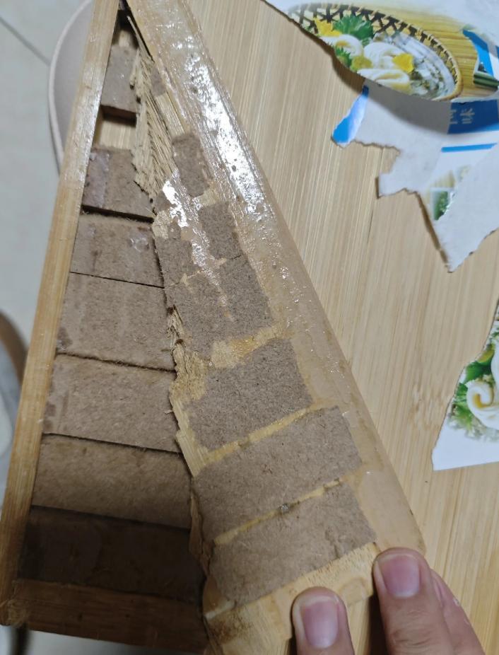 這種拼接的木砧板,良心一點的,裏面可能給用膠水粘幾根木方,沒良心的商家,直接就在裏面填充密度板了!(上圖這種的砧板,內部的東西甚至都不是鋸末壓成的密度板,而是垃圾碎紙屑壓成的東西)