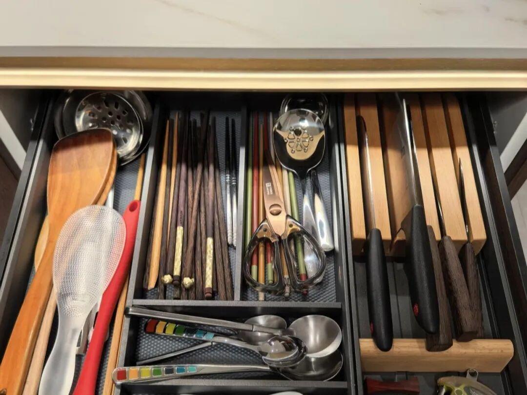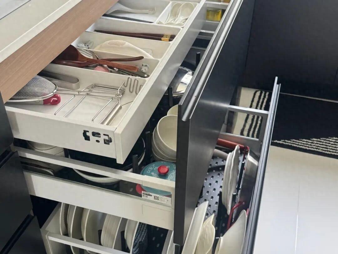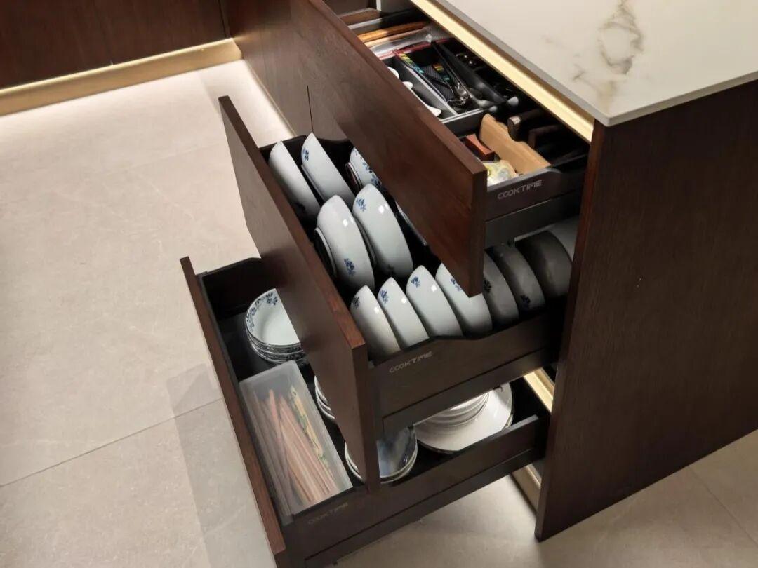 地櫃抽屜。地櫃幾乎是全拉式的抽屜,取代了傳統的地櫃門的地櫃,內部配置了分隔件,像餐具、鍋具都可以分類碼放,拉開也是一目瞭然。