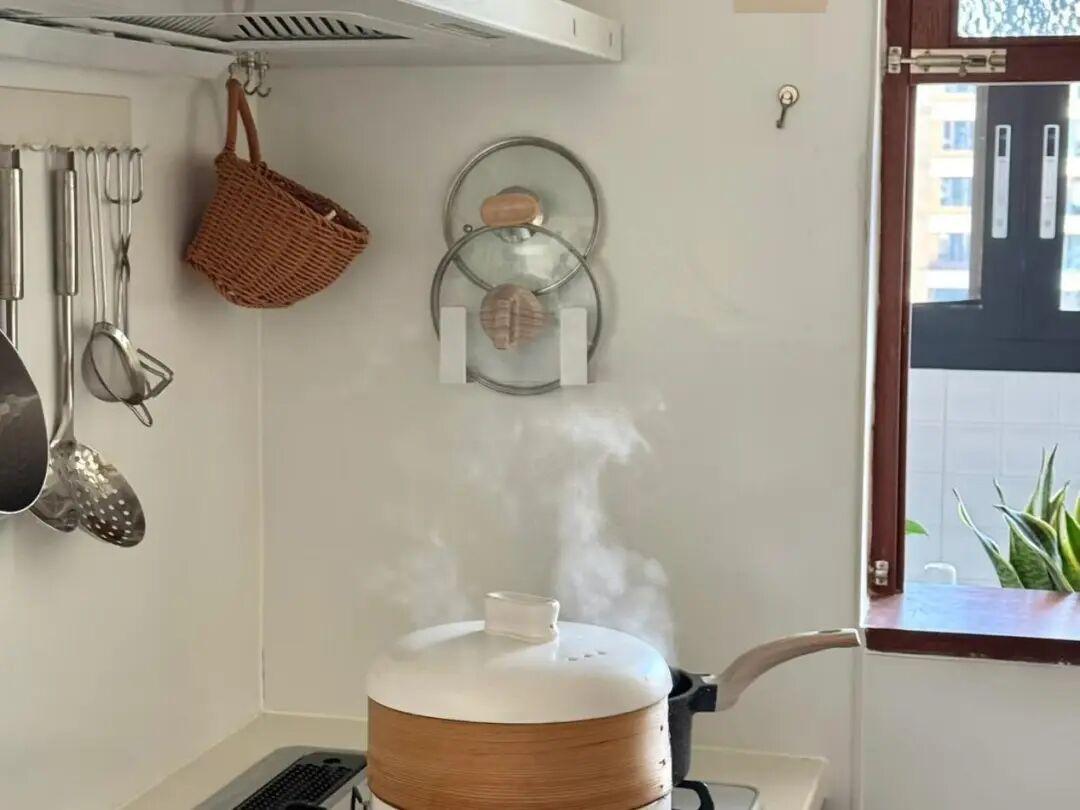 她家在廚房天花下安裝了一個可升降的吊架,它主要用於懸掛不常用的鍋具和物品,需要的時候降下來,平時不會影響室內空間。