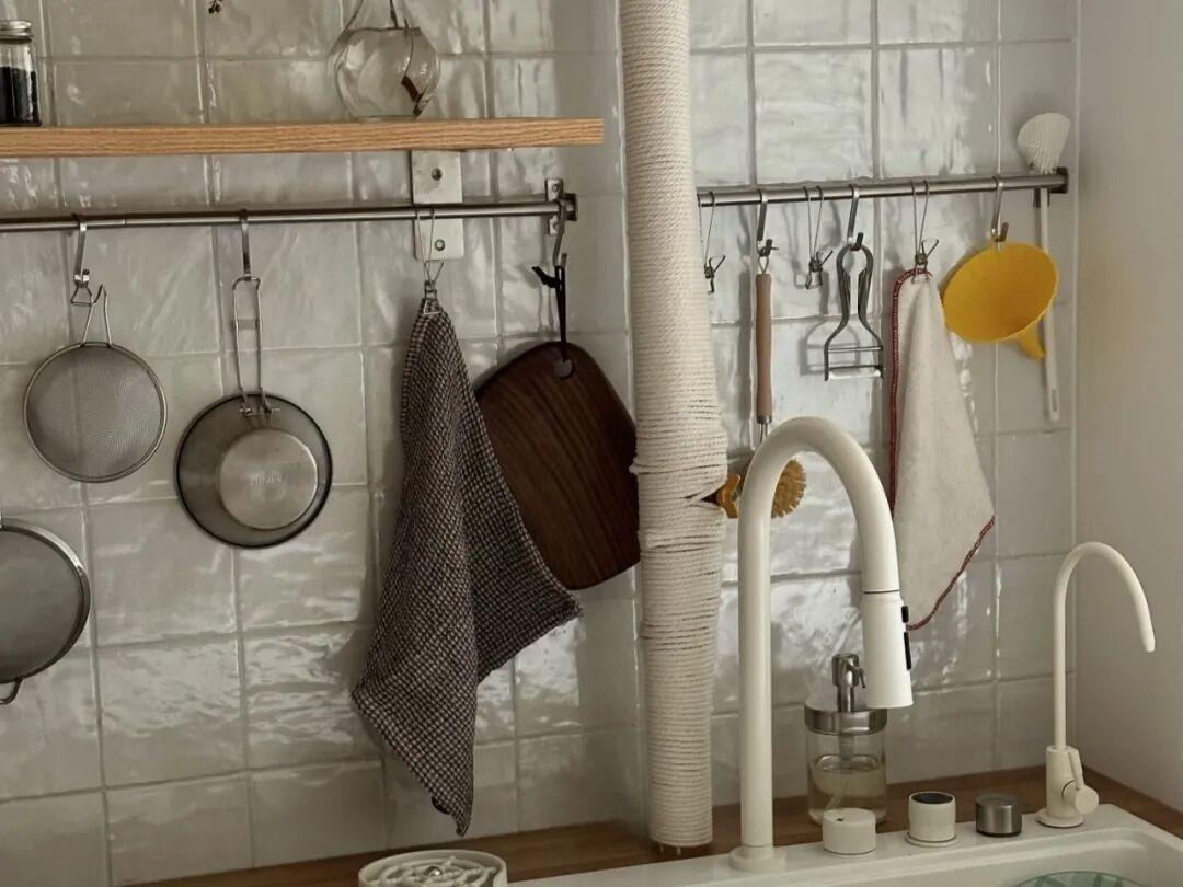 可調節掛鉤。在水槽和竈臺的上面,安裝了可調節的金屬掛鉤。不同大小的鍋鏟,勺子,打蛋器,都可以整齊的掛在上面,又能通風又幹燥,還能避免滋生細菌。