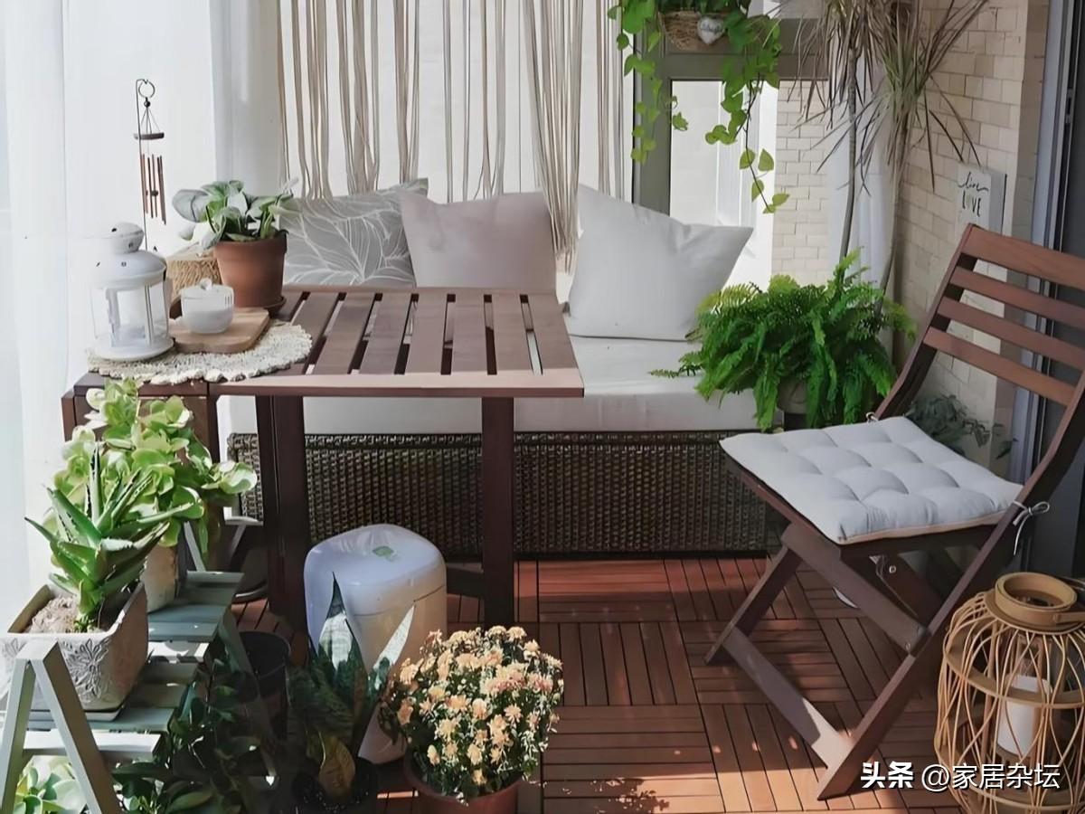 對於陽臺的傢俱,選擇戶外專用的防腐木,藤編或者是金屬傢俱,避免被太陽曬壞。另外,可以利用牆面打造收納櫃,存放雜物,保持陽臺整潔。