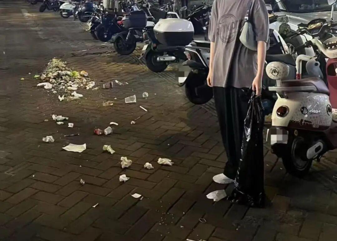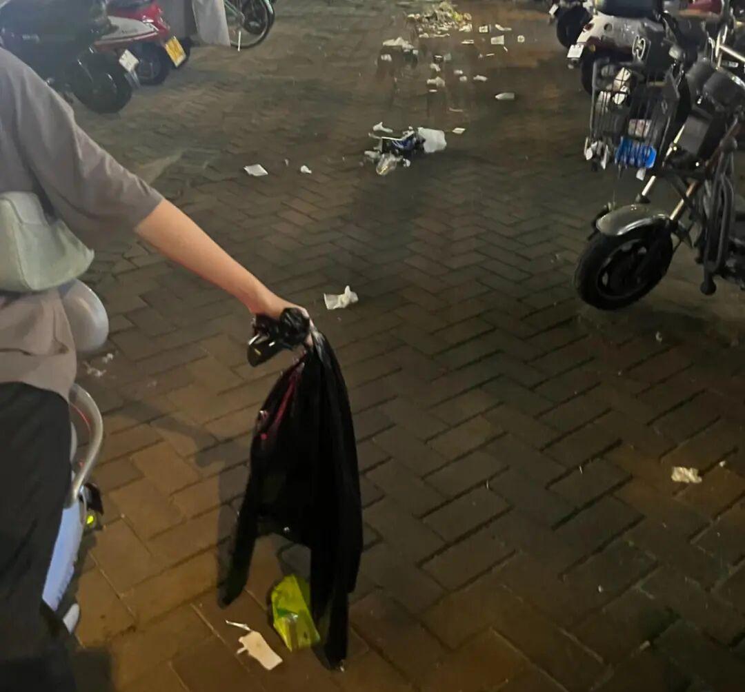 裏面的外賣盒、廢紙、瓜子皮天女散花,撒了一地,還飄到了旁邊奔馳的前擋風上。