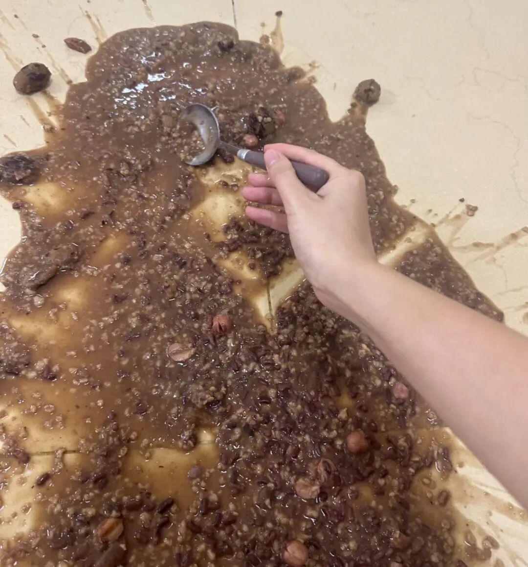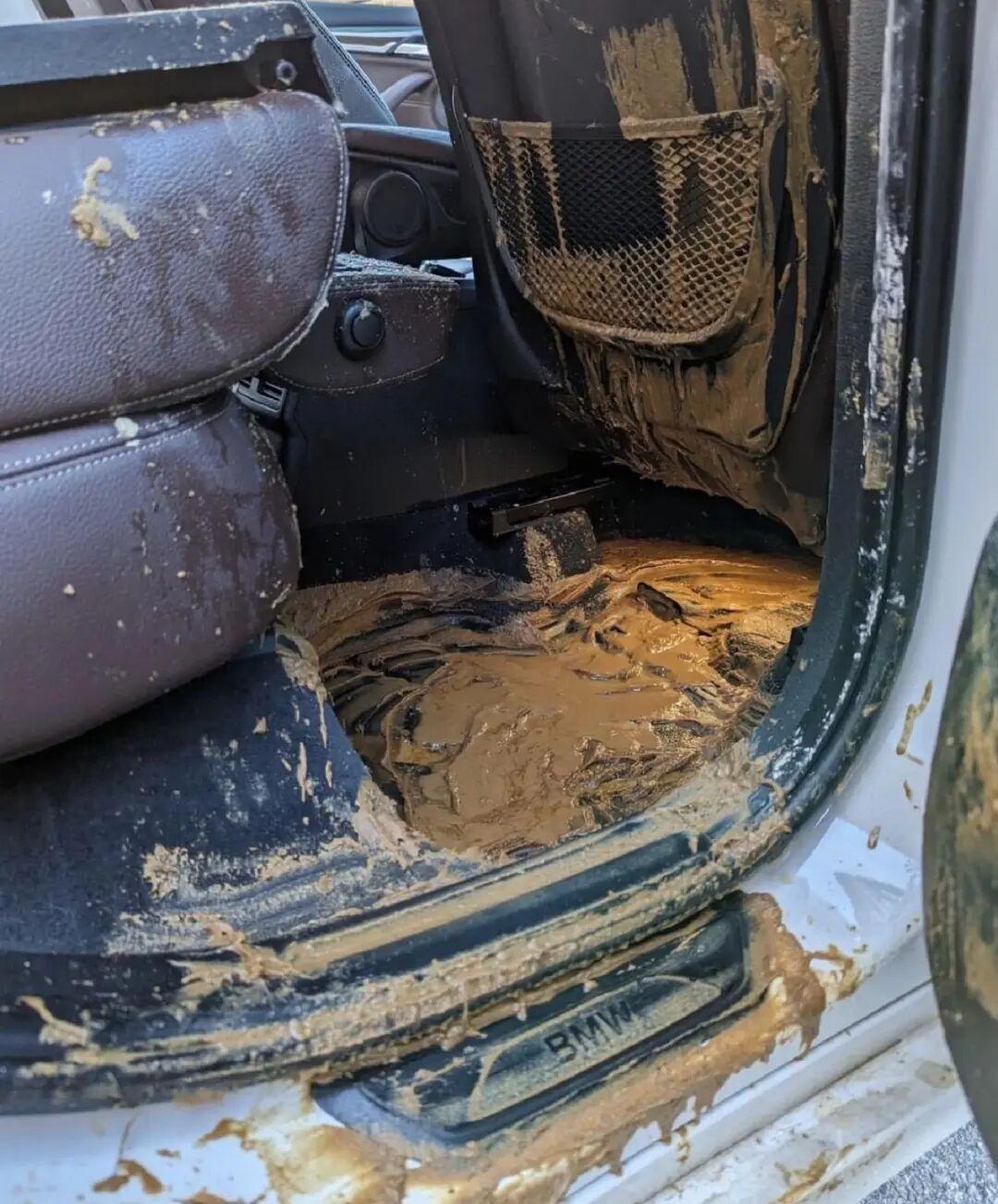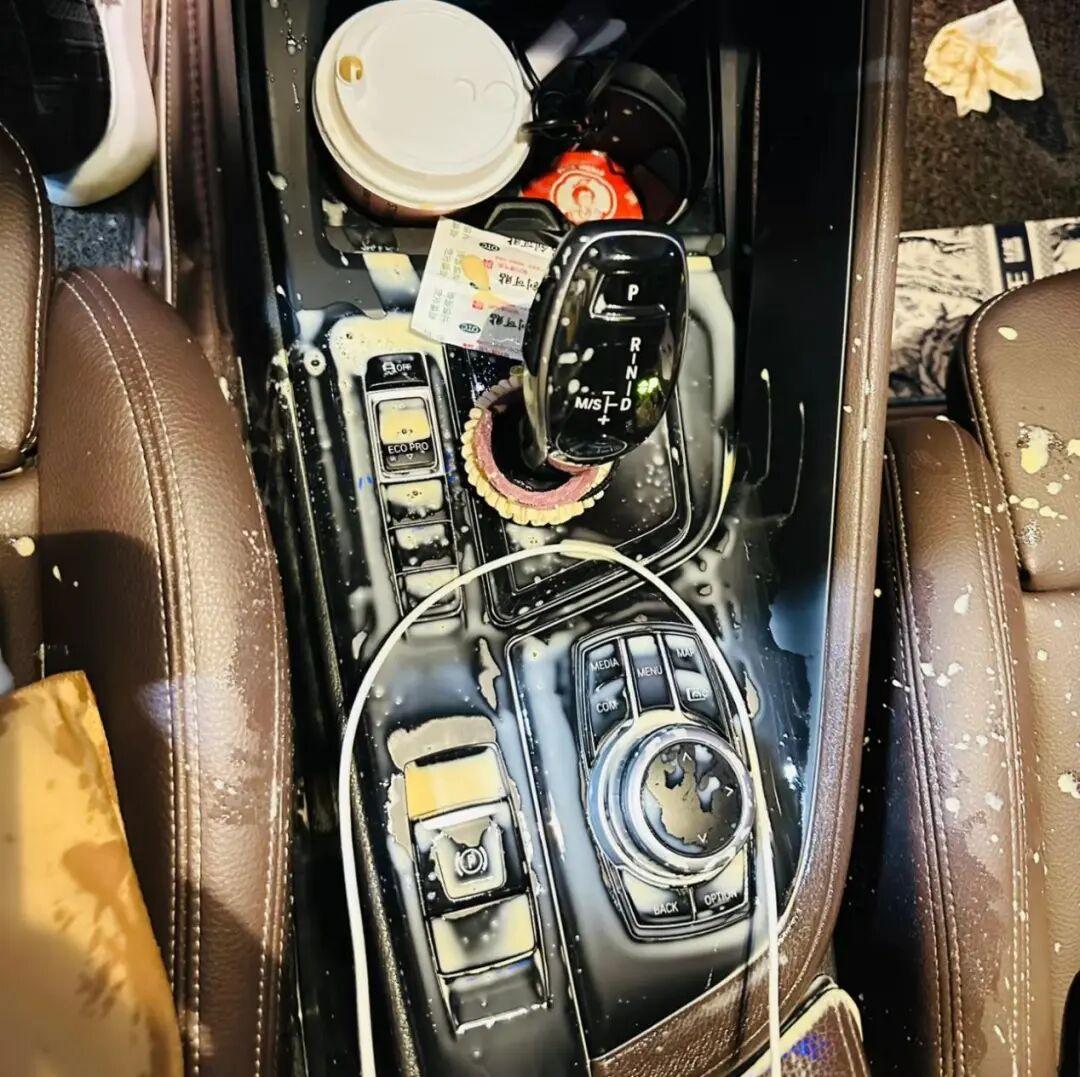 黏稠的花生醬噴了後排座椅、車門、甚至車頂一手掌大的面積
