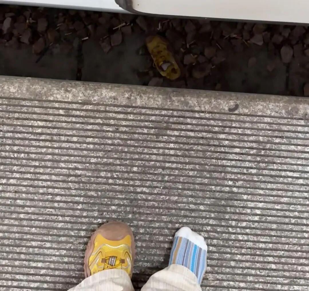 一着急把一隻腳上的鞋直接甩下了站臺,落在鐵軌旁