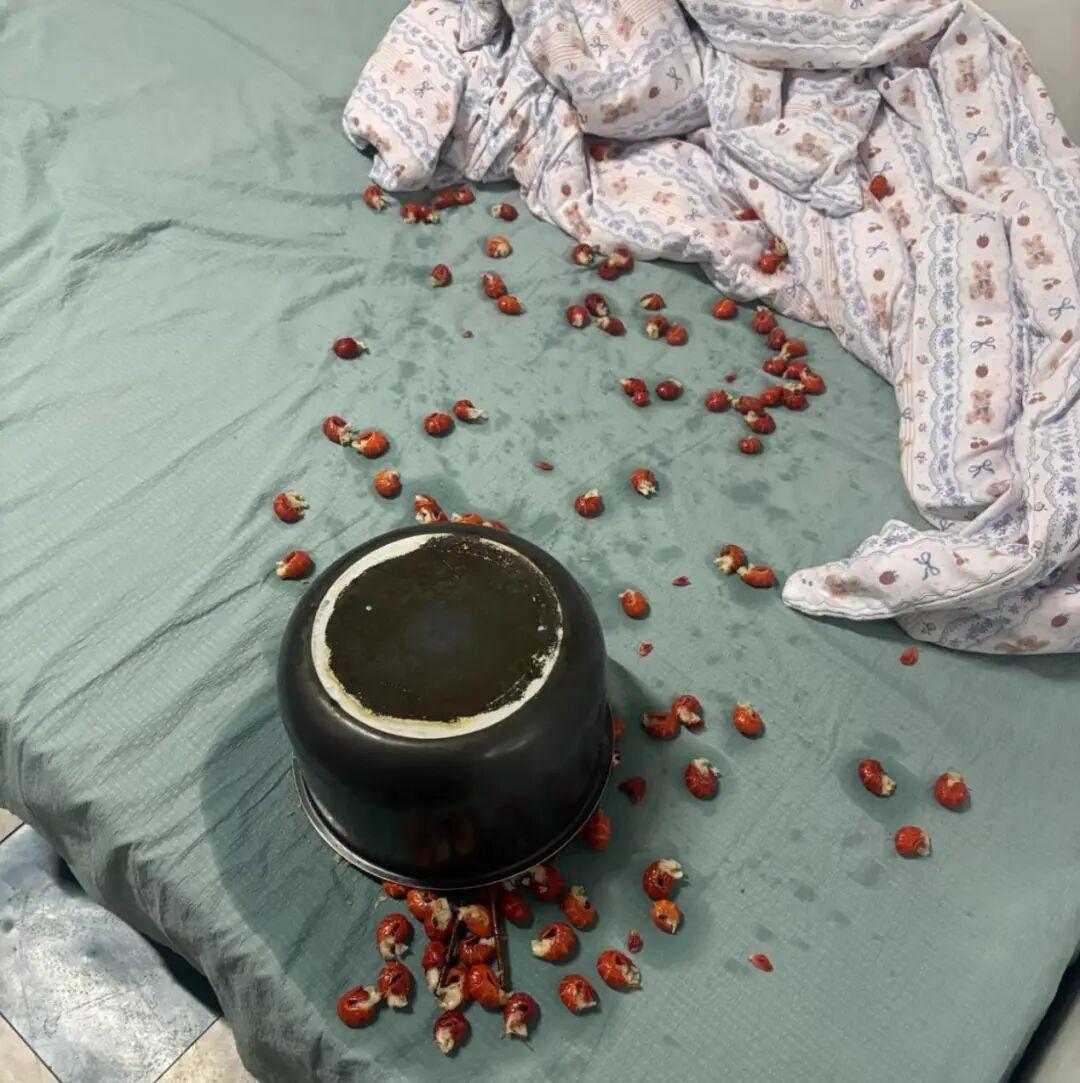 我愣了三秒,第一反應不是救牀單,而是趕緊搶救最上面那幾只還乾淨的小龍蝦。