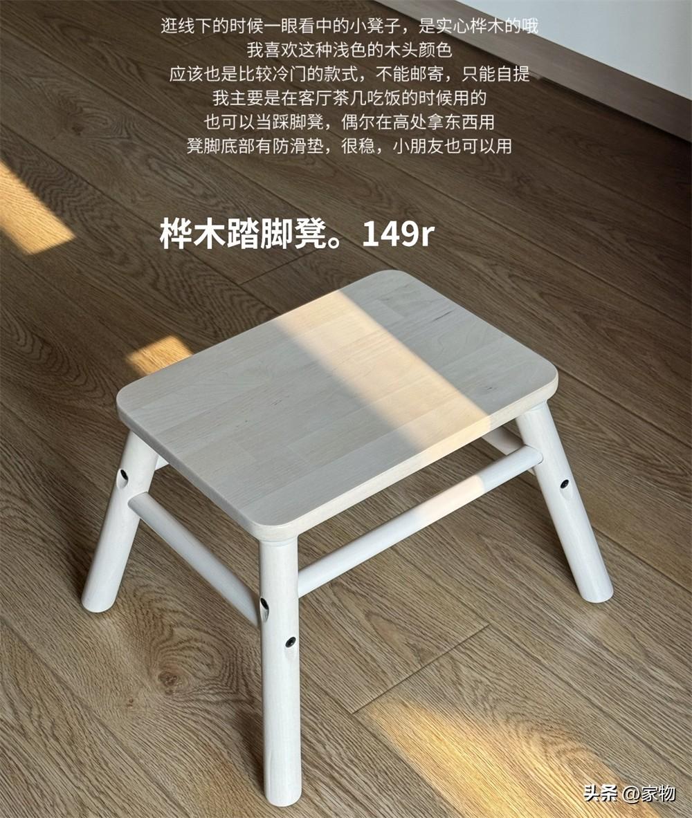 這個樺木的踏腳凳,就是我個人感覺其中的佼佼者,顏色比較清淺,但也有清晰的木紋,平時當個小板凳,或者踏腳墊高拿東西的小凳子,都非常合適哦。