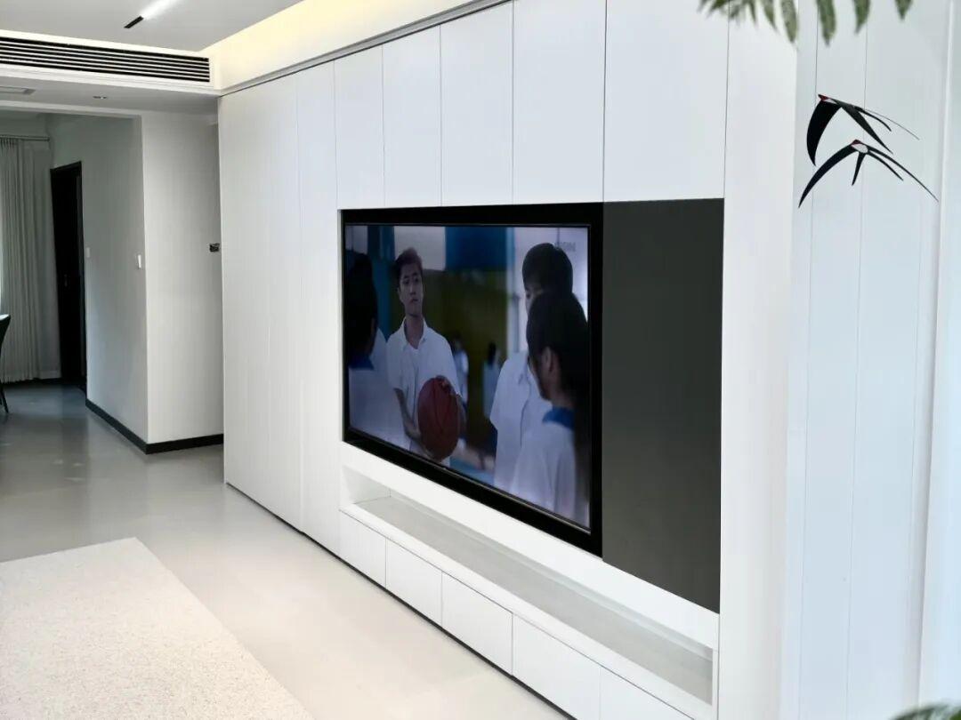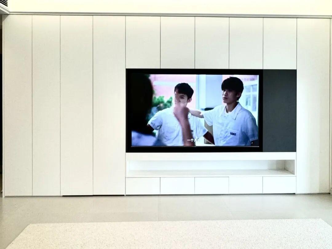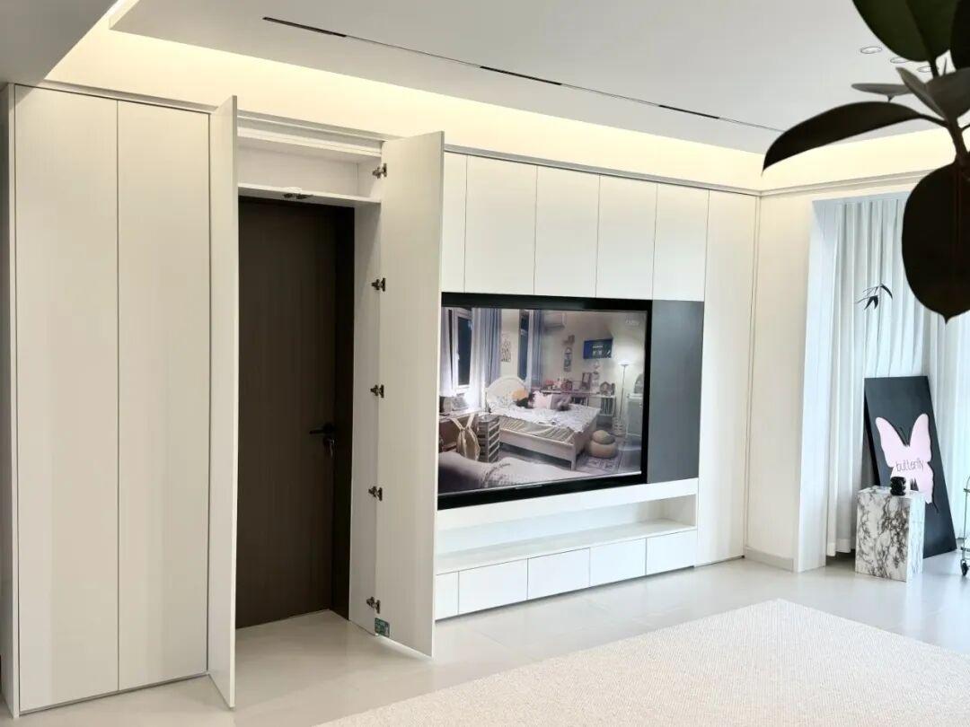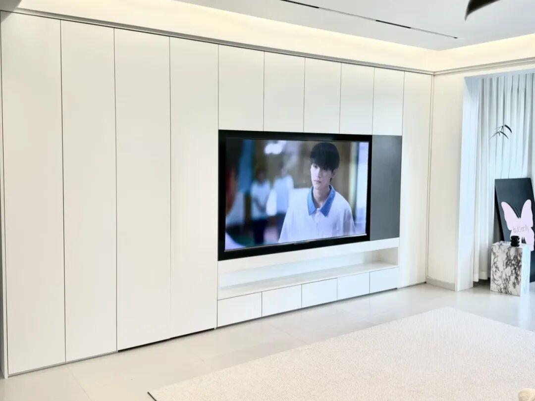 這次裝修時啊、,整面電視牆被做成了收納櫃,收納櫃採用的是無把手設計,櫃門與牆面是同顏色。