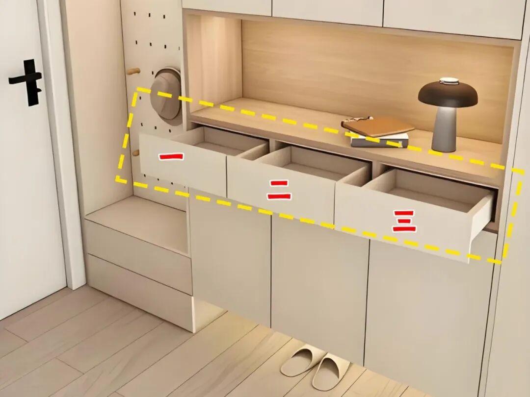裝修時可以根據家庭成員的身高定製換鞋凳的高度,通常40~45釐米,下方還可能以做成抽屜,增加儲物。