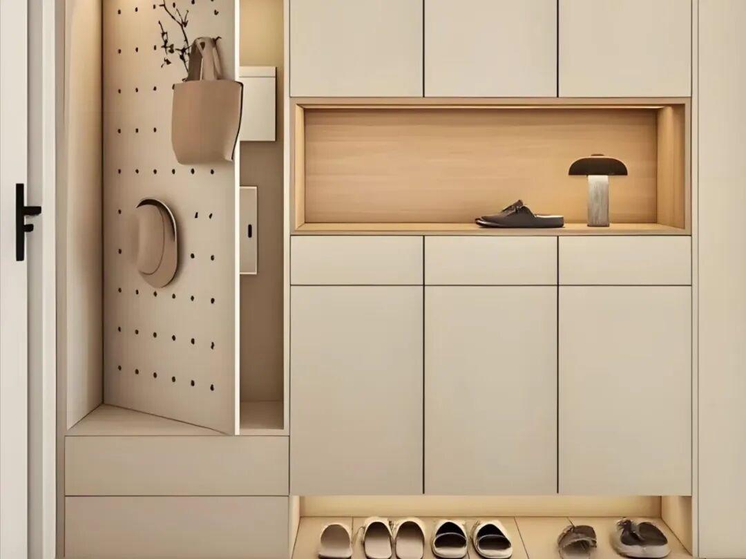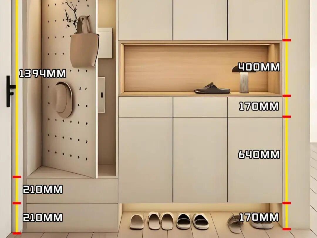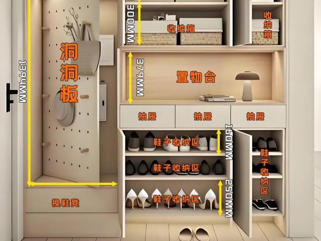 玄關鞋櫃的深度,建議做35釐米左右,可以放置各種類型的鞋子了。