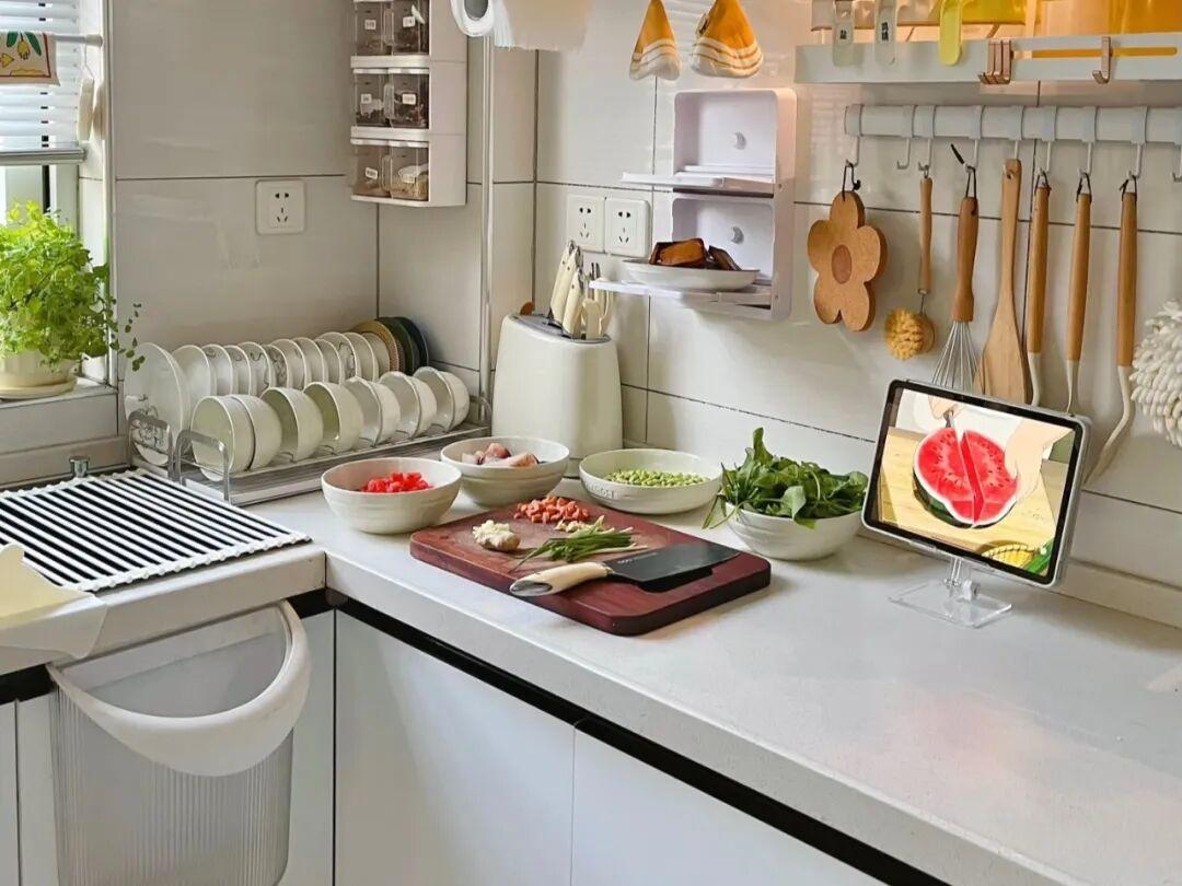 而吊櫃的下方安裝了感應燈和掛杆系統,像家裏的鍋鏟、刀具,都可以掛在上面,還安裝了磁吸牆面收納系統,實現了垂直收納。