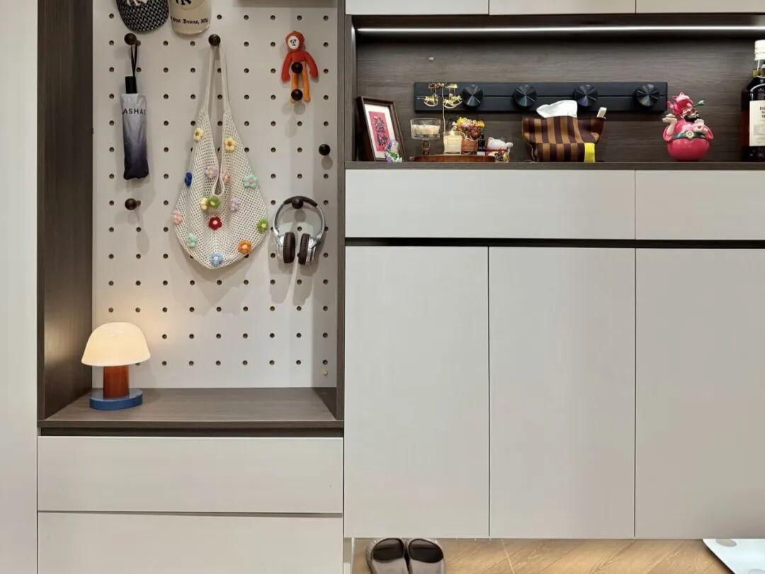 裝修的時候,拆除了傳統的鞋櫃,定製了頂天立地的多功能玄關櫃。懸空櫃的底部留出了18釐米的懸空區,用來放置日常穿的鞋;中間設置了置物區和抽屜,用來放鑰匙,口罩等小物件。