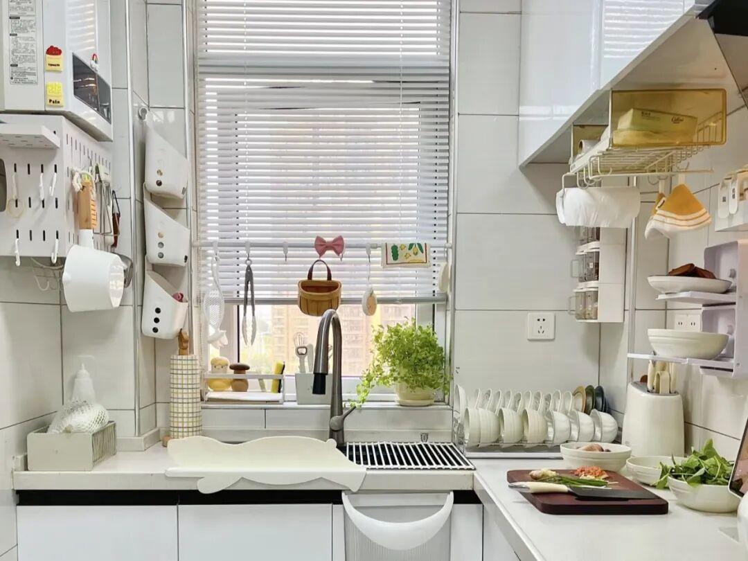 廚房裝修採用的是u型廚房加上窄櫃的組合。在竈臺的對面安裝了一排深度差不多30公分的窄櫃,用來存放調料乾貨和小工具。