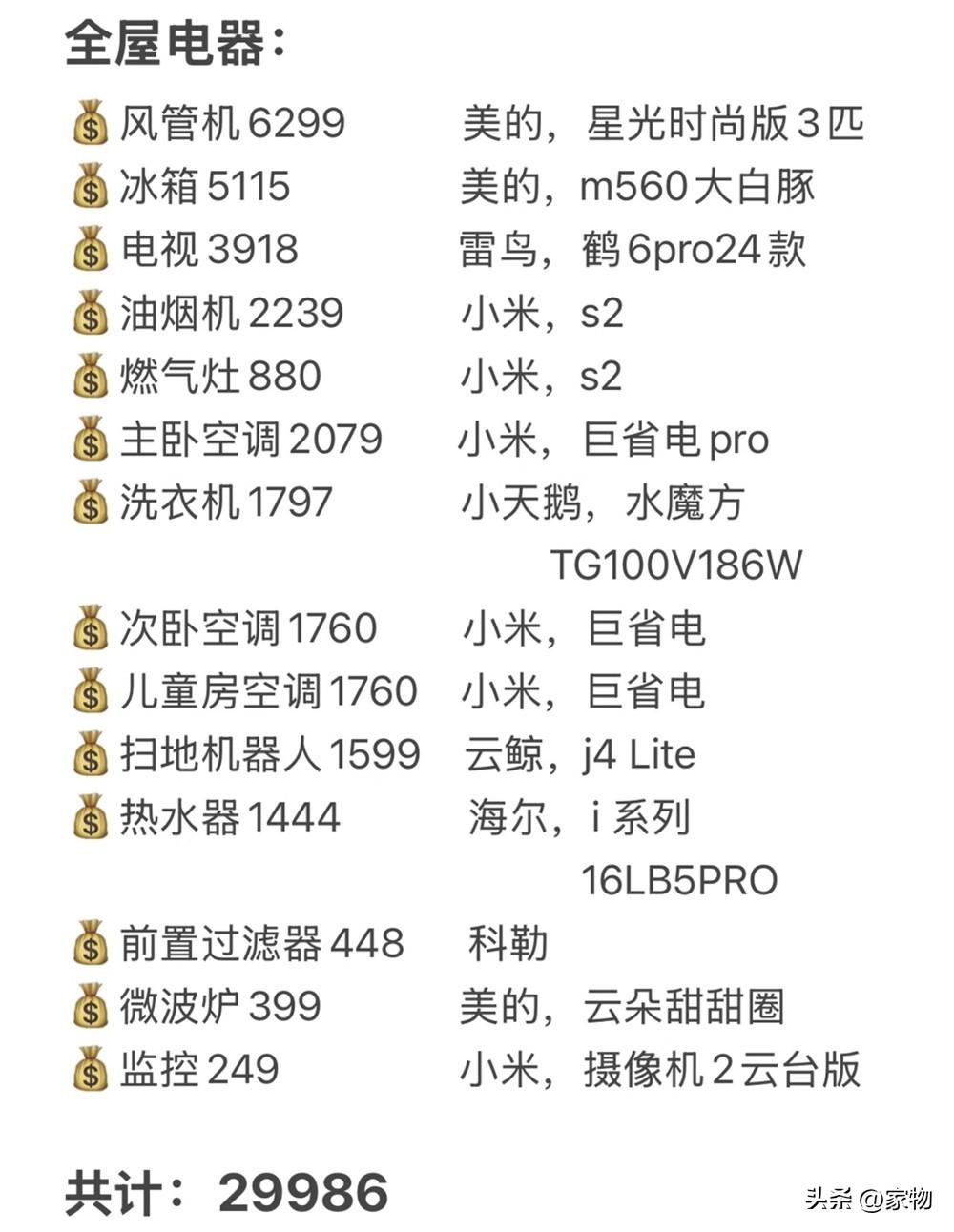 現在買家電其實真沒那麼貴了,即便是想要好一些的,百平米左右的房子,全屋家電3W內也完全能搞定!