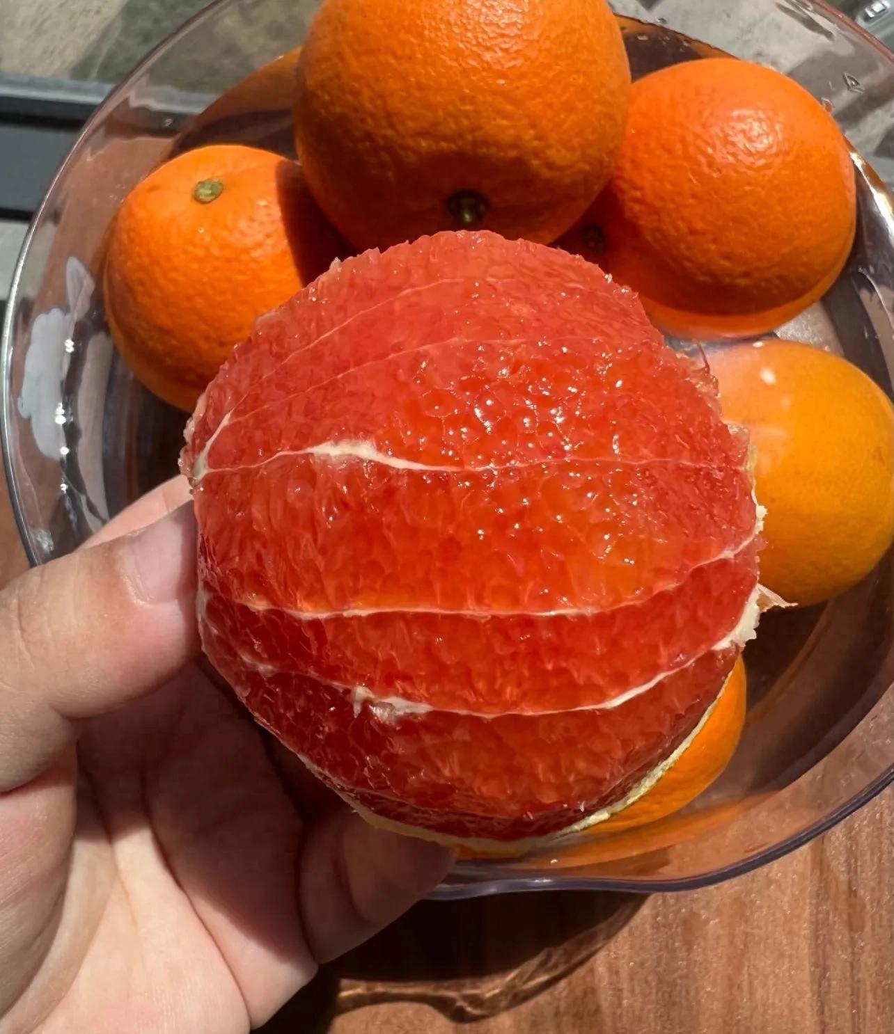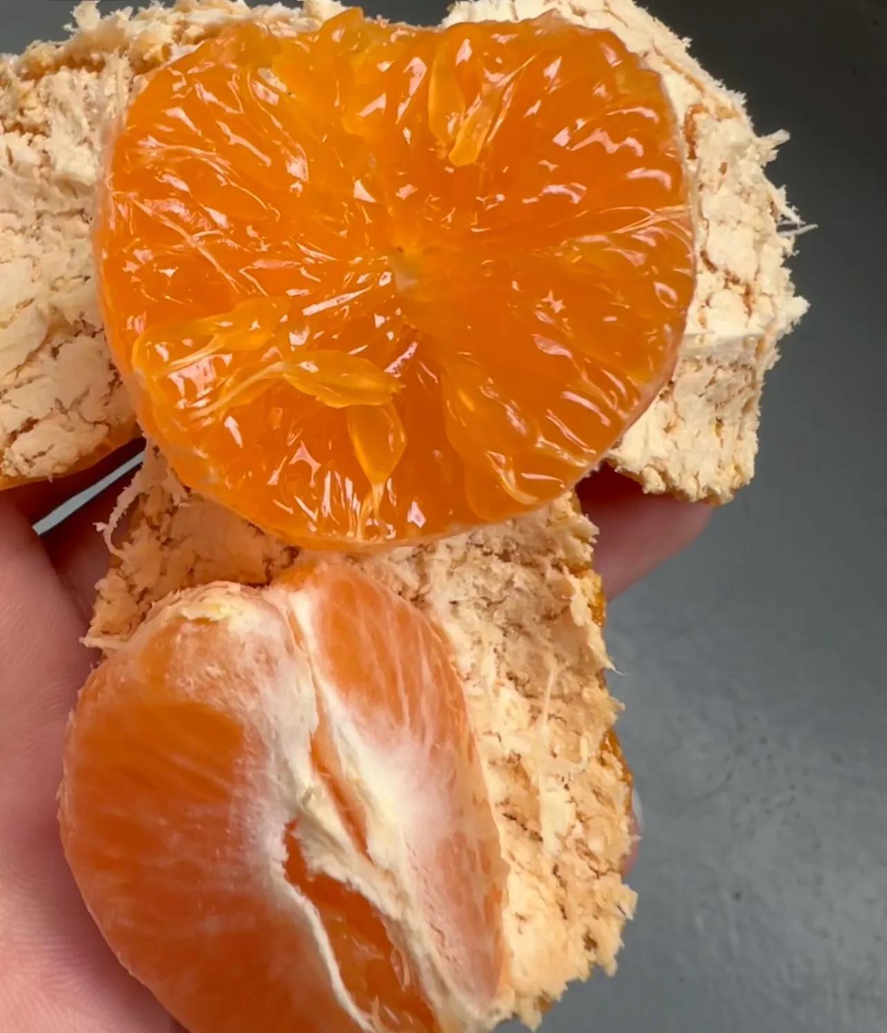 外果皮超好剝,完全不費指甲;內果皮一般會隨着直接爆開,我以前喫很多桔子是不喫內果皮的,這個我就能喫桔子不吐桔子皮;桔粒像果凍一樣好看,真有點入口即化的感覺。
