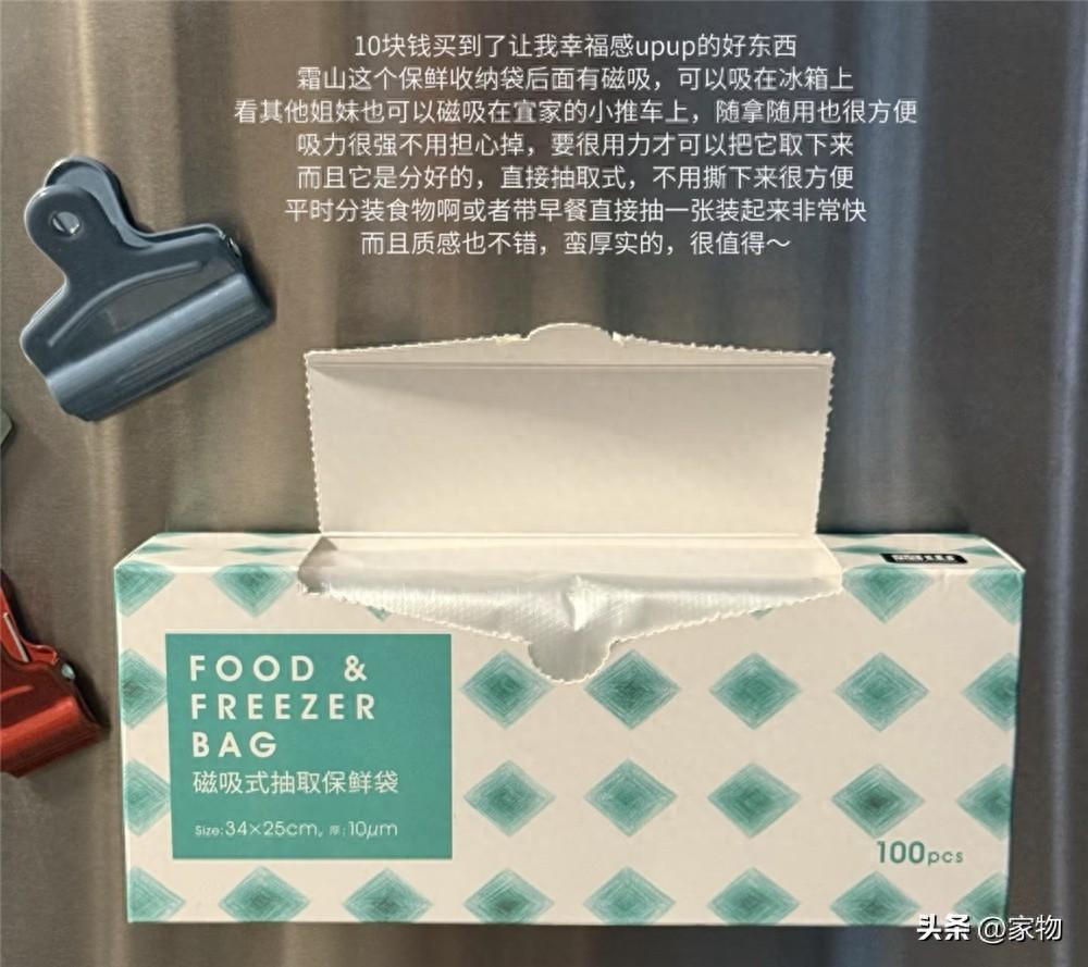 先說說這保鮮袋,一盒有一百抽,但才賣十塊,盒子背後有磁吸條,可以吸附在冰箱門或者家裏其他金屬表面上,方便收納和抽取,用的時候直接拿出來一個,裝些水果蔬菜或者上班時要帶的小零食都很合適。