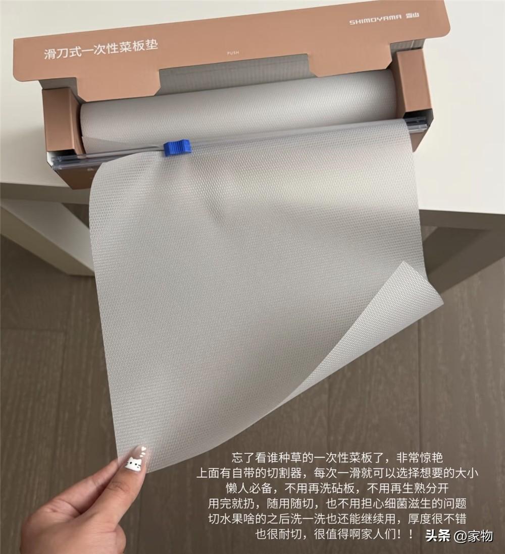 說是一次性菜板,但實際上是個加厚的食品級塑料膜,不想刷案板的時候,就用上面自帶的裁切滑刀切一點放到櫥櫃上用,不僅能保護櫥櫃檯面,同時還更加衛生,真的超級實用,推薦諸位試試。