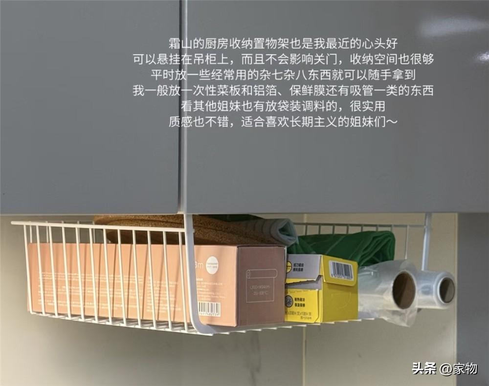 這收納籃也是個掛在吊櫃底下的收納器具,我感覺唯一的遺憾就是它會讓櫃門突出幾毫米,建議兩扇櫃門底部都掛一個,看起來會整潔許多。