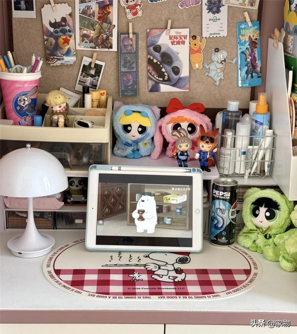 桌面確實非常小,但反而讓她養成了妥善佈置的習慣——留出桌面日常使用區域,深處放多層架收納化妝品和各種零散雜物,甚至還有一面牆專門釘照片做裝飾,亂中有序,又實用又有生活氣息。