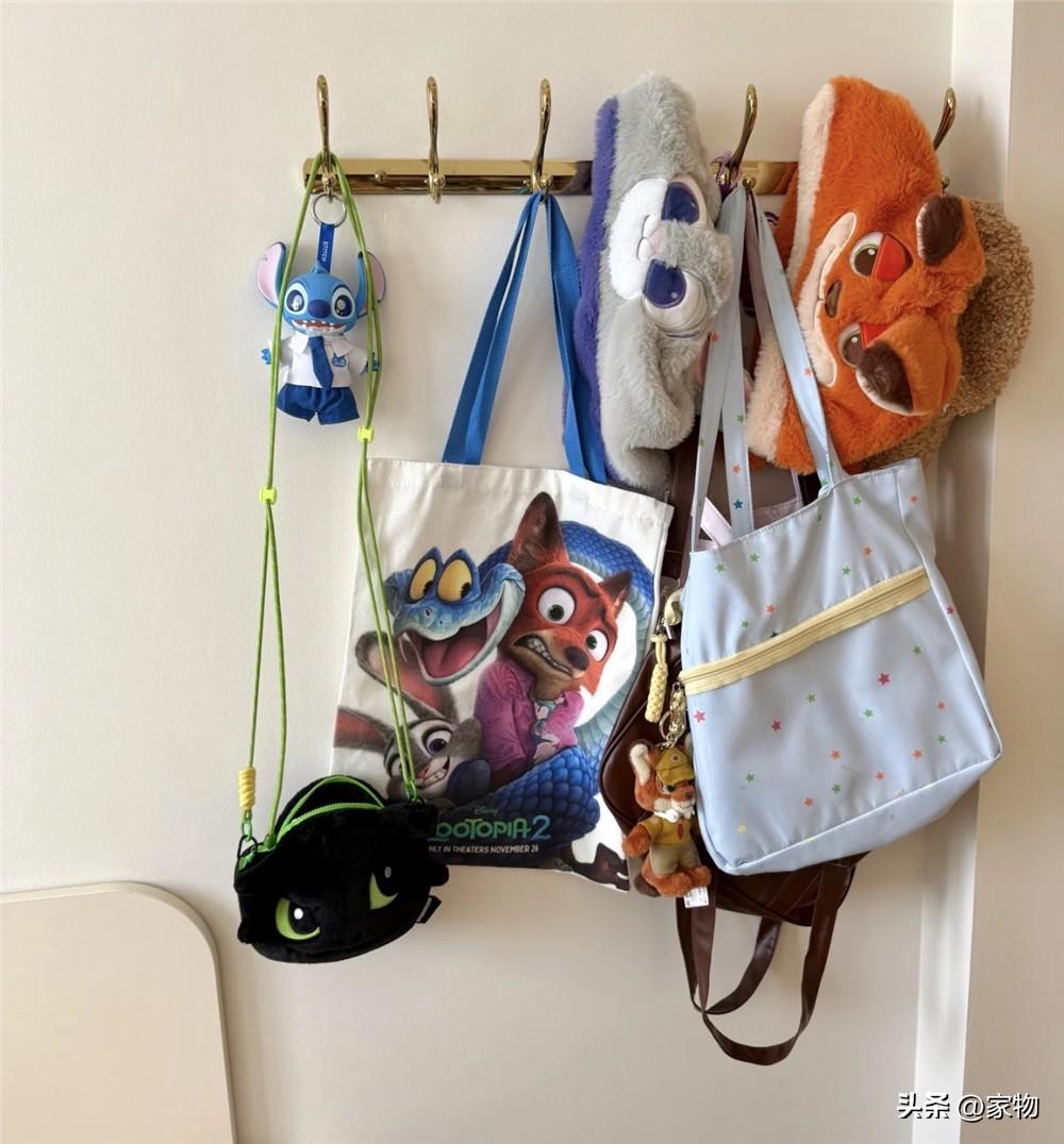 除此之外,她還利用門後面內凹的牆壁,安裝了一個橫向掛衣架,用來收納包包、外套、鑰匙鏈等日常生活用品,打開門以後天然將它們隱藏在了門後面,既不浪費空間,看起來也會更加整潔,一舉兩得。