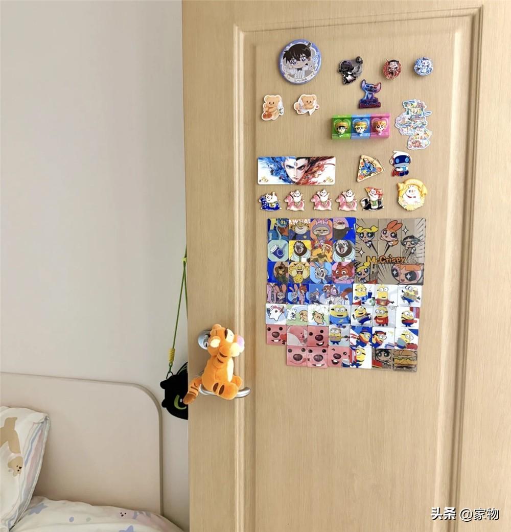 先說這房門,上面貼滿了各種各樣可愛的卡通動漫人物裝飾,爲這迷你臥室增添了幾分活潑可愛和個性化的色彩。