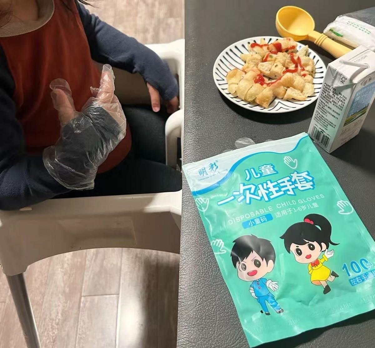 沒想到兒童也有一次性手套了,真是完美解決了這個小難題。它採用食品級材質製作,安全無毒,可以放心讓孩子使用。而貼合手型的設計既保證了防護效果,又不影響孩子抓握食物。